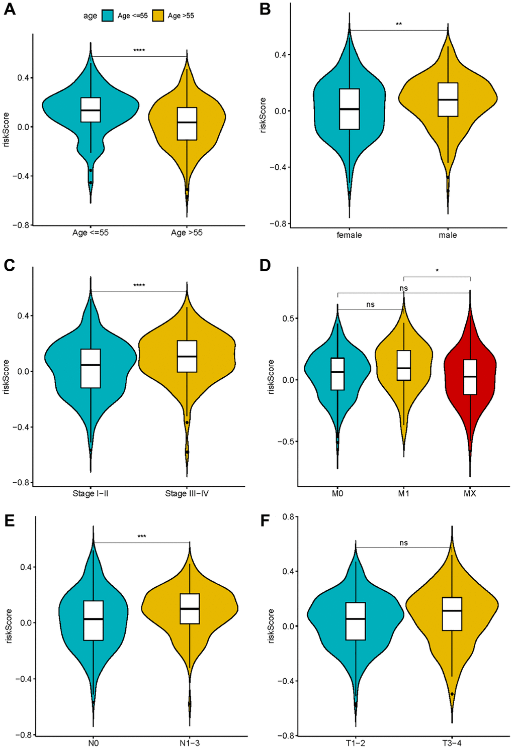 The association between risk scores and clinical features, including gender, age, pathological stage, and TNM classification, was determined using the Wilcoxon test.
