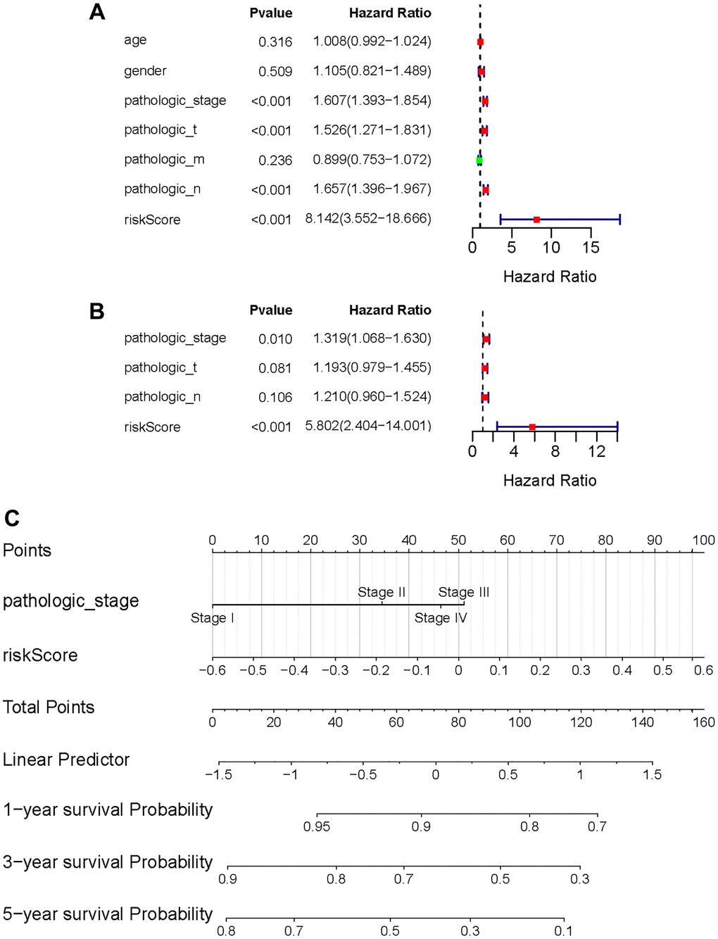 Following that, univariate and multivariate Cox regression analysis was used to determine whether the risk score was a prognostic factor for LUAD patients when independent of other clinical factors in this study. Pathological stage, T phase, N phase, and the risk metric were all intertwined with patient fate (Figure 7A). Multivariate Cox regression analysis results emphasize the possibility that risk score can independently predict the prognosis of patients (Figure 7B). Furthermore, in the multivariate analysis, the pathologic stage was determined to be a significant prognostic predictor. Then, using independent prognostic markers such as pathologic stage and risk score, we built a nomogram that could predict patients OS in one, three, and five years (Figure 7C). The value obtained by calculating the C index of the nomogram was 0.6966719, suggesting an excellent accuracy in predicting patient survival.