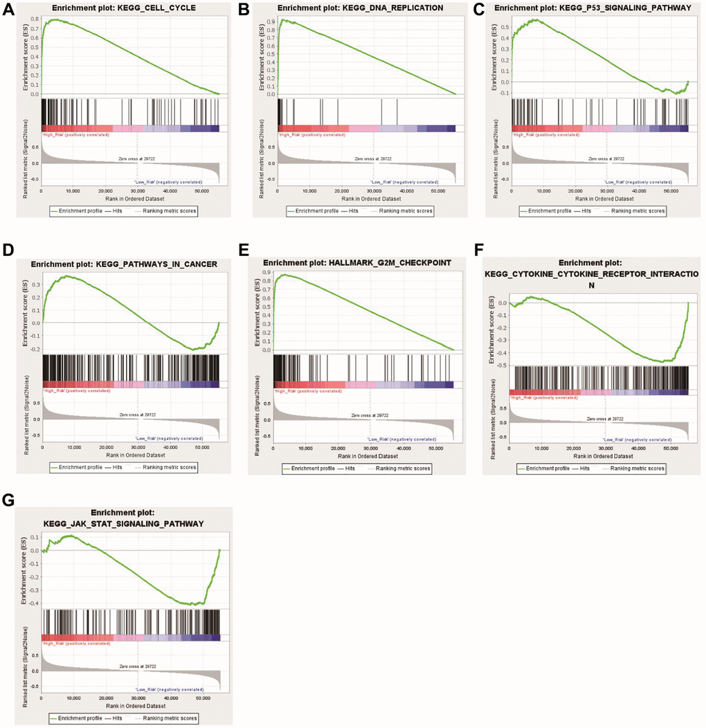 The enrichment pathways of the high- and low-risk categories are listed in Supplementary Table 6. Among them, the high-risk consortium manifested enrichment in terminologies like ‘kegg_cell_cycle’, ‘kegg_dna_replication’, ‘kegg_p53_signaling_pathway’, ‘kegg_pathways_in_cancer’, and ‘hallmark_g2m_ checkpoint’ (Figure 8A–8E). The Opposite group showcased elevated indices of immune-centric pathways like “kegg_cytokine_cytokine_receptor_interaction” and “kegg_jak_stat_signaling_pathway” (Figure 8F, 8G).