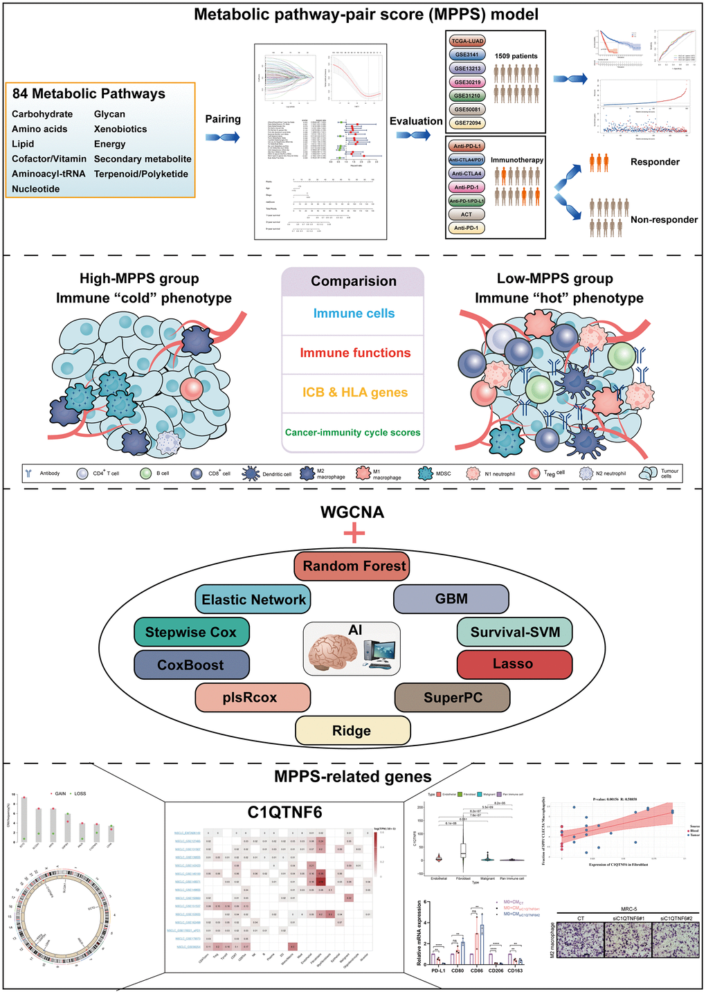 Based on some metabolic features, many metabolic signature-based prognostic models have been established and acquired good predicting performance [14, 21, 22]. However, most models are based on a single metabolic pathway, lacking comprehensive exploration for tumor metabolism. Moreover, most models are constructed by focusing on exact gene expression and commonly unapplicable in another cohort sequenced by different platforms. To overcome the above shortcomings, we comprehensively assessed 84 metabolic pathways from 12 kinds of metabolism in LUAD by single sample gene set enrichment analysis (ssGSEA), developed and validated a metabolic pathway-pair score (MPPS) model to accurately predict the prognosis and immunotherapy efficacy of LUAD patients regardless of sequencing platforms. The model performed better than 51 published signatures of LUAD and was applicable to pan-cancers. The distinct metabolic features, TME between high- and low-MPPS groups were depicted. Weighted gene co-expression network analysis (WGCNA) and 117 machine learning algorithm combinations were performed and identified 7 MPPS-related genes, of which C1QTNF6 was mainly expressed in fibroblast. C1QTNF6 expression in fibroblast is positively related to fibroblasts, M2 macrophages and Treg cells infiltration but negatively related to memory CD8+ T cells and NK cells infiltration. Silencing C1QTNF6 expression in fibroblast impaired M2 macrophage polarization and migration in vitro assays. Meanwhile, mendelian randomization (MR) also indicated that C1QTNF6 was cause of lung cancer onset. The MPPS model overcomes the obstacle of sequencing data from different platforms and is promising to guide LUAD patients’ selection for immunotherapy.