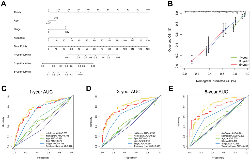 To construct a MPPS-based nomogram for convenient use, we analyzed the prognostic value of MPPS, age, sex, pathological stage and treatment type by univariable and multivariable Cox regression analyses (Table 1). In the univariable Cox regression analysis, age (HR (95%CI): 1.43 (1.056-1.936), P=0.021), stage (HR (95%CI): stage II 2.302 (1.590-3.332), P<0.001; stage III/IV 3.295 (2.309-4.702), P<0.001) and MPPS (HR (95%CI): 1.042 (1.036-1.049), P<0.001) were significantly related to LUAD prognosis. After adjusted by multivariable Cox regression analysis, MPPS, age and pathological stage were identified as independent prognostic factors and used to construct a prognostic nomogram (HR (95%CI): age 1.45 (1.065-1.975), P = 0.018; stage II 2.371 (1.637-3.434), P < 0.001; stage III/IV 2.537 (1.756-3.667), P < 0.001; MPPS 1.039 (1.032-1.046), P < 0.001). The prognostic nomogram made quantitative predictions of the 1-, 3-, and 5-year OS probabilities in patients with LUAD (Figure 10A). The calibration curves exhibited a high consistency between the predicted and actual 1-, 3-, and 5-year OS (Figure 10B). The ROC curves displayed the nomogram had higher AUC values than the single predictor such as MPPS, age, sex, stage, treatment type (1-, 3-, 5-year AUC: 0.793, 0.821, 0.82) (Figure 10C–10E).