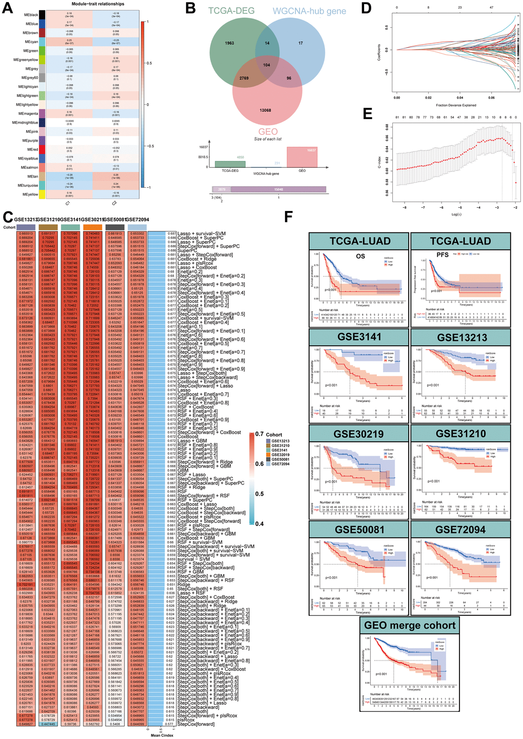 Ten machine learning algorithms and 117 algorithm combinations were utilized to identify hub genes related to MPPS with high accuracy and stability performance on prognostic prediction. The integrative algorithms included random survival forest (RSF), stepwise Cox, elastic network (Enet), Lasso, Ridge, CoxBoost, partial least squares regression for Cox (plsRcox), generalised boosted regression modelling (GBM), supervised principal components (SuperPC), and survival support vector machine (survival-SVM). The procedure was as follows: (a) Univariable Cox regression analysis was used to screened out prognostic genes from the candidate genes; (b) Next, 117 algorithm combinations were performed on the prognostic genes to identified hub genes based on the leave-one-out cross-validation (LOOCV) framework in the TCGA-LUAD cohort; (c) All hub genes derived from 117 algorithm combinations were validated in six independent validation cohorts (GSE13213, GSE31210, GSE3141, GSE30219, GSE50081, GSE72094); (d) The hub genes with the highest average C-index across all validation cohorts were considered optimal.