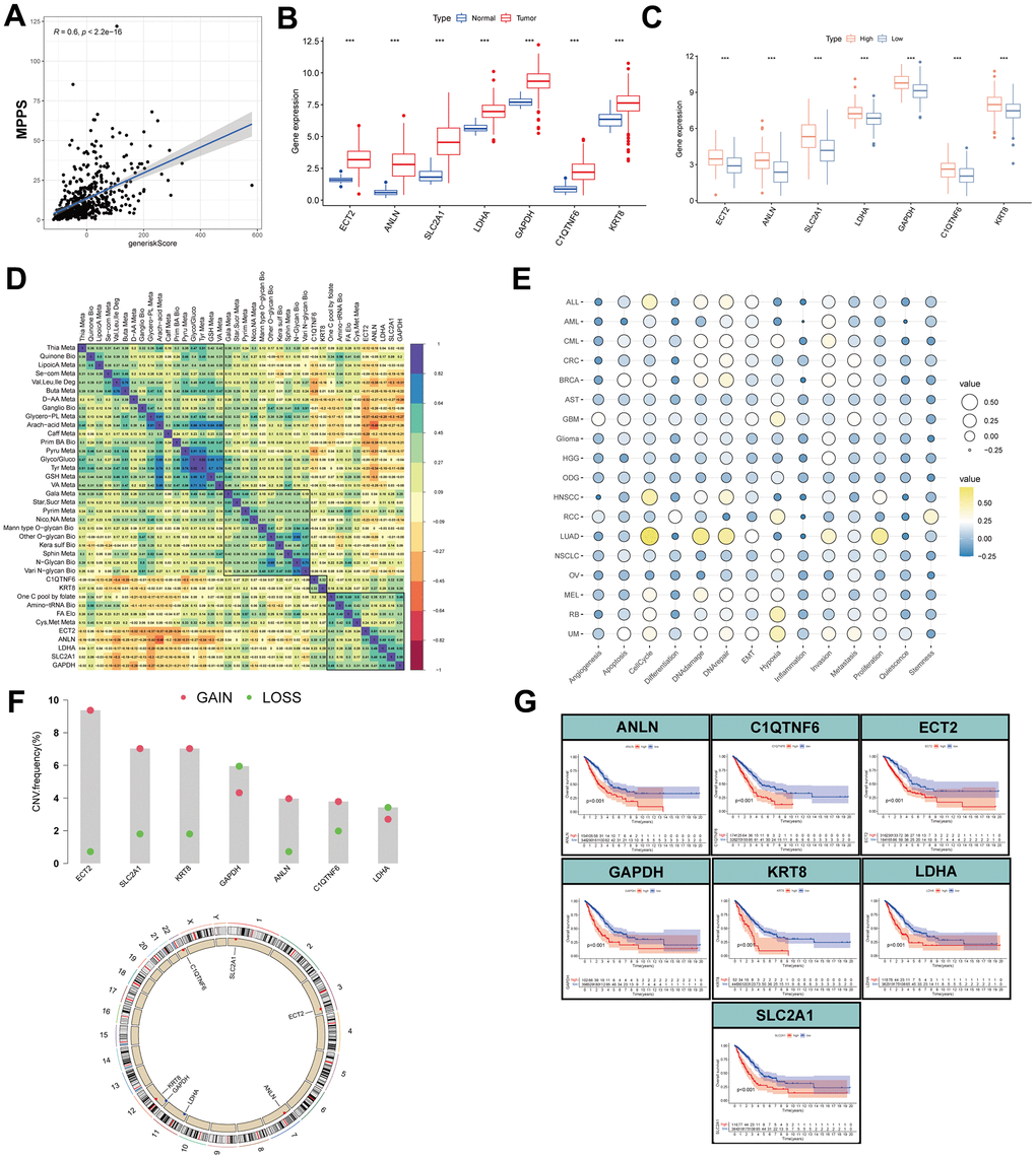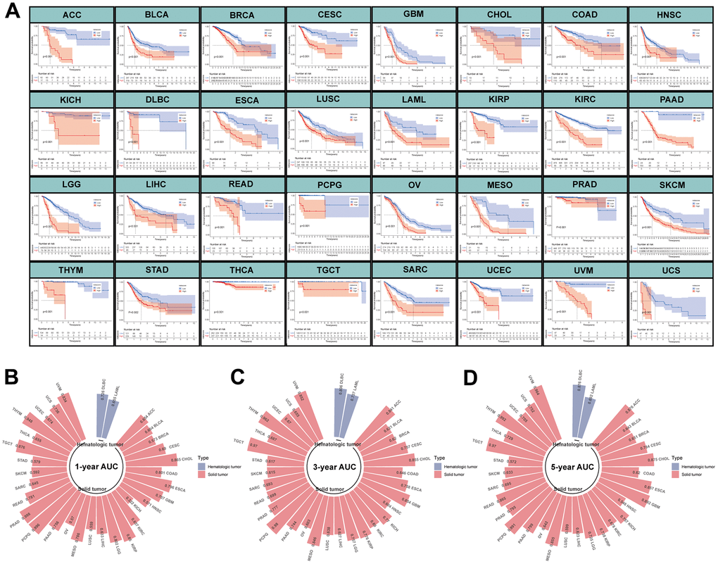 To further investigate the performance of MPPS on predicting prognosis of other tumors, we performed survival analyses of patients in the high- and low-MPPS groups involving 32 types of tumors in TCGA other than LUAD. Patients in the high-MPPS group had significantly worse OS than low-MPPS group in all 32 tumors (P < 0.05) (Figure 5A). MPPS also displayed high 1-, 3-, 5-year AUC in predicting prognosis of 32 tumors (Figure 5B–5D).