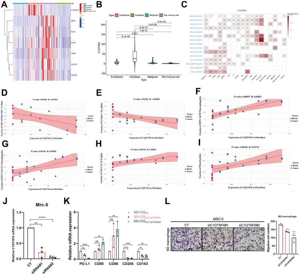 To validate the hypothesis, we constructed MRC-5 cells with C1QTNF6 silencing by siRNAs. As shown in Figure 13J, the specific cells were successfully established with high silencing efficiency. After 48h, the supernatant was collected, centrifuged and prepared as CM. To detect the effects of silencing C1QTNF6 in MRC-5 cells on macrophages polarization, we cultured M0 macrophages with the mixture of CM and FBS-containing medium (1:1) for 48h. Compared to the control, the group with C1QTNF6 silencing had significantly decreased PD-L1 and M2 macrophage-related genes expression (CD163, CD206). Conversely, M1 macrophage-related genes expression (CD80, CD86) were obviously increased when C1QTNF6 was silenced in MRC-5 (Figure 13K). Furthermore, we successfully induced M0 to M2 macrophage by IL-4 and IL-13 stimulation (Supplementary Figure 6F). The macrophage migration assay showed that silencing C1QTNF6 in MRC-5 cells could reduce M2 macrophage migration in vitro (Figure 13L). These fundings suggested that C1QTNF6 expression in MRC-5 cells promoted M2 macrophage polarization and recruitment.