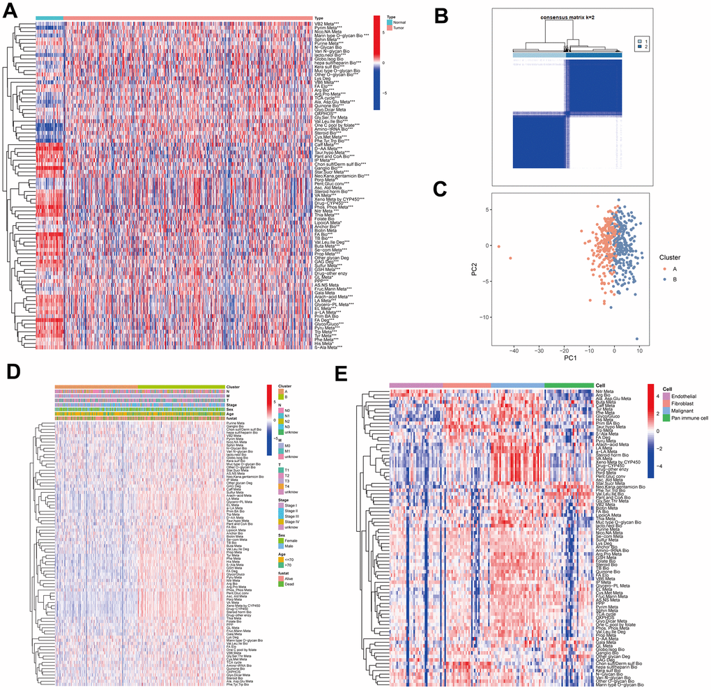 The levels of 84 metabolic pathways were estimated in each sample by ssGSEA. Then the metabolic differences of LUAD and normal samples were analyzed by “limma” package. An unsupervised consensus clustering according to 84 metabolic pathways scores was performed to identify distinct LUAD metabolic subtypes, which were showed by the principal component analysis (PCA). The metabolic profiles of TME cells including endothelial cells, malignant cells, cancer-associated fibroblasts (CAFs) and pan-immune cells were compared using single-cell RNA sequencing data (GSE111907).