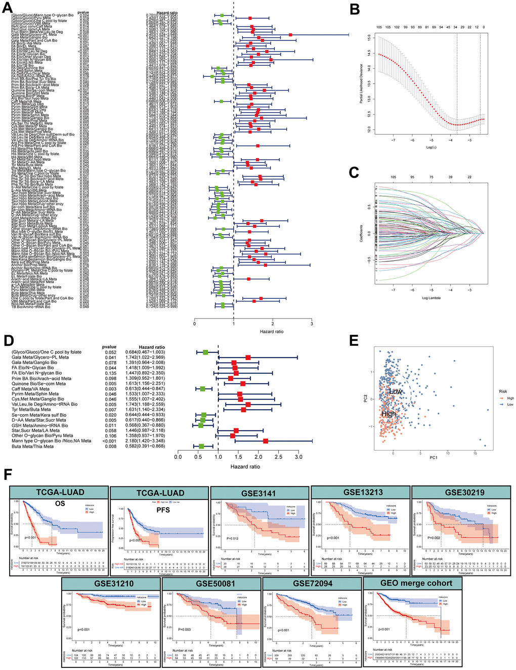 Different sequencing platforms commonly possess different sequencing depth. Consequently, sequencing data from different sequencing platforms had different numbers of genes and significantly different expression levels. When gene expression data from different platforms were utilized, data standardization and scaling and intersecting gene from different platforms are needed, which will cause loss of some genetic information. The metabolic pathway pair model can reduce the effects of some gene deletion on prediction and eliminate the shortcomings of data standardization and scaling in gene expression data processing and effectively avoid the interference caused by the sequencing platform. To develop a prognostic model based on MPPS, we firstly paired the 84 pathways and 525 pathway pairs were obtained after removing those pathway pairs that proportion of 0 or 1 was more than 80% or less than 20%. Subsequently, we conducted univariable Cox regression analysis on these pathway pairs and selected 106 meaningful metabolic pathway pairs for Least absolute shrinkage and selection operator (LASSO) regression analysis (Figure 3A). LASSO regression analysis yielded 33 metabolic pathway pairs with nonzero LASSO coefficients according to the optimal λ value (Figure 3B, 3C). Multivariable Cox regression analysis was further performed to identify prognostic metabolic pathway pairs based on Akaike information criterion value and 19 metabolic pathway pairs were finally obtained (Figure 3D). MPPS was calculated using value of 19 metabolic pathway pairs weighted by their multivariable Cox regression coefficients and stratified LUAD patients into high- and low-MPPS groups according to the optimal cut-off point determined by the “survminer” package. PCA analysis showed that LUAD patients could be divided into distinctive groups according to MPPS (Figure 3E). The heatmap showed obvious discrepancy of 19 metabolic pathway pairs between the high- and low-MPPS group (Supplementary Figure 1A). Patients with high-MPPS scores had significantly shortened overall survival (OS) and progression-free survival (PFS) in the TCGA-LUAD training cohort and six GEO validation cohorts (all P < 0.05). The GEO merge cohort integrating the six GEO cohorts also showed the same trend (P < 0.05) (Figure 3F). The risk plot of MPPS indicated that as MPPS increased, OS time decreased while mortality rose (Supplementary Figure 1B).