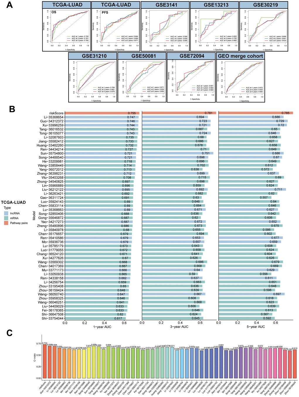 To investigate the accuracy of the MPPS model, ROC analysis was conducted and showed good performance in both training cohort and validation cohort (1-, 3-, 5-year AUC: 0.755, 0.781, 0.785 in OS of TCGA-LUAD; 0.664, 0.689, 0.671 in PFS of TCGA-LUAD; 0.599, 0.658, 0.695 in OS of GSE3141; 0.832, 0.705, 0.682 in OS of GSE13213; 0.699, 0.641, 0.633 in OS of GSE30219; 0.789, 0.661, 0.678 in OS of GSE31210; 0.671, 0.624, 0.693 in OS of GSE50081; 0.641, 0.663, 0.684 in OS of GSE72094; 0.672, 0.633, 0.66 in OS of GEO merge cohort) (Figure 4A). With the developments in next-generation sequencing, a considerable number of prognostic models were developed. To compare the performance of MPSS with other signatures, we retrieved 51 published signatures of LUAD including 15 lncRNA signatures and 36 mRNA signatures. These signatures encompassed various biological processes, such as autophagy, immune response, ferroptosis, stemness, epithelial-mesenchymal transition (EMT), hypoxia, ageing, methylation et al. The results suggested that MPSS had highest 1-, 3-, 5-year AUC of TCGA-LUAD cohort (Figure 4B). MPPS also displayed higher C-index in TCGA-LUAD cohort than almost all models (Figure 4C).
