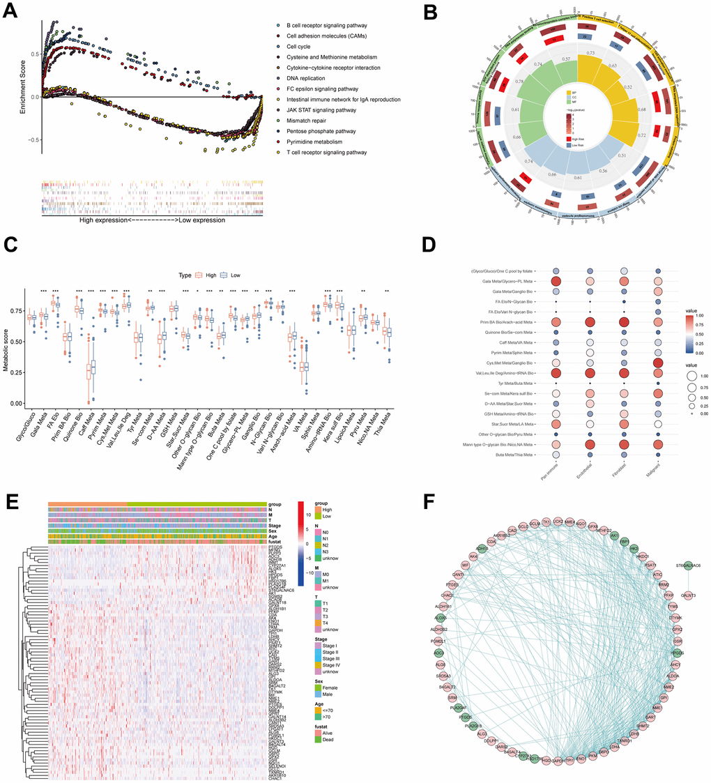 To characterize metabolic reprogramming involved in MPPS, we firstly analyzed the variation of 31 pathways in MPPS model between LUAD and normal lung tissues. A total of 26 pathways were dysregulated in LUAD, in which 7 metabolic pathways were up-regulated and 19 metabolic pathways were down-regulated (Supplementary Figure 3B). Further analyses revealed that 22 pathways were significantly variant between the high- and low-MPPS groups. The high-MPPS group had higher metabolic scores in the galactose metabolism, fatty acid (FA) elongation, pyrimidine metabolism, cysteine and methionine metabolism, one carbon pool by folate and aminoacyl-tRNA biosynthesis et al. indicating that biomass synthesis and proliferation were more active in the high-MPPS group. The low-MPPS group had higher metabolic scores in the caffeine metabolism, valine, leucine and isoleucine degradation, selenocompound metabolism and arachidonic acid metabolism, etc. (Figure 6C). The correlation of MPPS and 31 metabolic pathways was shown in Supplementary Figure 3C. By calculating the averages of 19 metabolic pathways pairs in each kind of TME cell, we found the lung malignant cells had higher level of cysteine and methionine metabolism/ganglio series biosynthesis than the immune cells, endothelial cells and fibroblasts (Figure 6D). The further differential expression analysis displayed that there existed obviously differential expression in 31 metabolic pathway genes between the high- and low-MPPS groups and the protein-protein interaction analysis demonstrated that the 76 DEGs had complex regulatory network (Figure 6E, 6F).