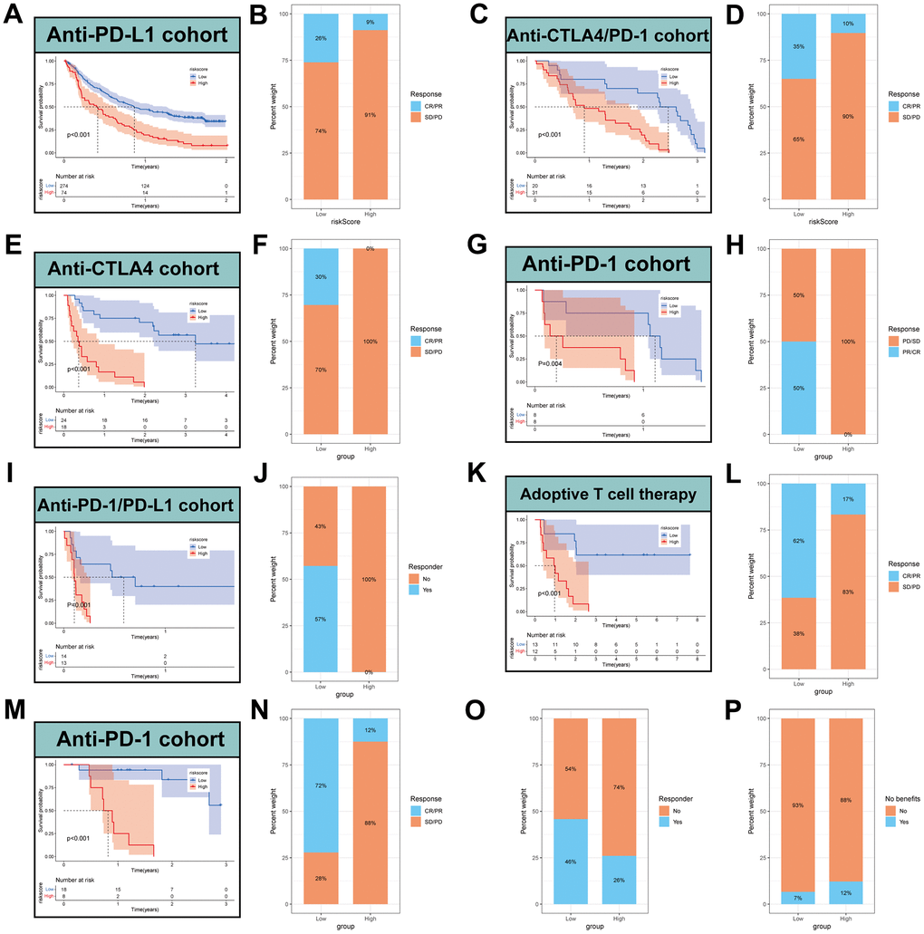 To further validate the speculation, seven independent immunotherapy cohorts in the published literatures were used to validate immunotherapy efficacy and prognosis including advanced urothelial cancer treated with atezolizumab, an anti-PD-L1 antibody, melanoma treated with anti-CTLA4 and anti-PD-1 therapy, metastatic melanoma treated with anti-CTLA4 therapy, non-small cell lung cancer (NSCLC) treated with nivolumab or pembrolizumab, an anti-PD-1 antibody, NSCLC treated with anti-PD-1/PD-L1 antibody, melanoma treated with ACT, Melanoma treated with anti-PD-1 antibody. The results showed that the low-MPPS group had significant survival advantage and higher immune response rate compared to the high-MPPS group in all validation cohorts (Figure 8A–8N). The response to anti-PD-1 and anti-CTLA4 therapy was calculated using the TIDE website based on TCGA cohort. Patients in the low-MPPS group were more likely to be responders and benefit from immunotherapy (Figure 8O, 8P).