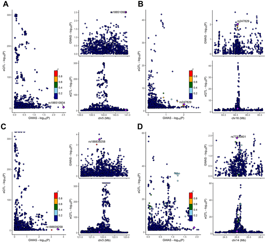 We performed co-localization analyses using the coloc algorithm on eQTL summary data and GWAS data from COPD. The 100-kilobase region around the index SNP was used to calculate the posterior probability. In the results, H3 indicated the posterior probability that two traits were correlated but had different causal variants; H4 indicated the posterior probability that two traits were correlated and shared a single causal variant.