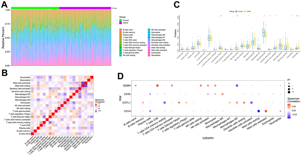 To assess the relative proportion of 22 types of immune infiltrating cells, we employed the CIBERSORT algorithm to analyze RNA-seq data from different sub-groups of COPD patients. Subsequently, we evaluated the correlation between gene expression levels and immune cell content using Spearman correlation analysis. P-value less than 0.05 was considered statistically significant.