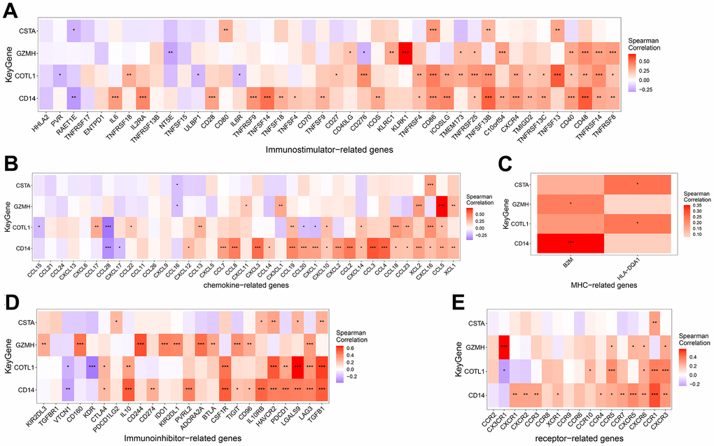 The microenvironment is mainly composed of immune cells, extracellular matrix, various growth factors, inflammatory factors, and special physicochemical features, etc. The microenvironment significantly influences the diagnosis of the disease, survival outcome, and sensitivity of clinical treatment. By analyzing the relationship between gene expression levels and immune infiltration, the potential molecular mechanisms by which the expression levels of key genes influence the development of COPD can be further explored. Our results showed that the distribution of immune levels of different immune factors in the samples was not entirely consistent (Figure 5A). There were several significant correlations among the immune factors (Figure 5B). monocytes, Dendritic cells activated, etc. were significantly higher in COPD samples than in control samples, while T cells follicular helper, Macrophages M2, etc. were significantly lower than in control samples (Figure 5C). The gene GZMH was significantly positively correlated with T cells CD8, NK cells resting, etc., and significantly negatively correlated with B cells naive, Macrophages M2; the gene COTL1 was significantly positively correlated with Macrophages M2, Dendritic cells resting, etc., and significantly positively correlated with T cells CD4 memory resting, Dendritic cells activated, etc.; gene CSTA is significantly positively correlated with Monocytes, Macrophages M0, etc., and negatively correlated with Plasma cells, NK cells activated, etc.; gene CD14 is significantly correlated with Mast cells activated, Neutrophils significantly positively correlated, and significantly negatively correlated with Plasma cells, Mast cells resting (Figure 5D). We obtained the correlations between these key genes and different immune factors, including immunomodulators, chemokines and cellular receptors from the TISIDB database, and the results showed that the key genes were significantly correlated with several immune factors (Figure 6).