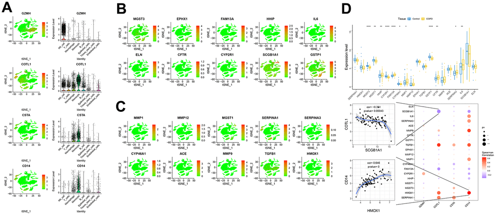 We obtained the disease genes associated with COPD through the GeneCards database (https://www.genecards.org/), and we analyzed the expression levels of four key genes (Figure 7A–7C) and the expression levels of the top 20 genes with the highest relevance score. We found that the expression levels of key genes were significantly correlated with the expression levels of several disease-related genes, including CD14, which was significantly positively correlated with HMOX1 (correlation coefficient=0.646), and COTL1, which was significantly negatively correlated with SCGB1A1 (cor=-0.351) (Figure 7D). Subsequently, we analyzed the expression of these four key genes and the top 10 immune genes with the highest relevance score at the single-cell level, and we found that the key genes were co-expressed with several immune genes at the single-cell level (Supplementary Figures 3–6).