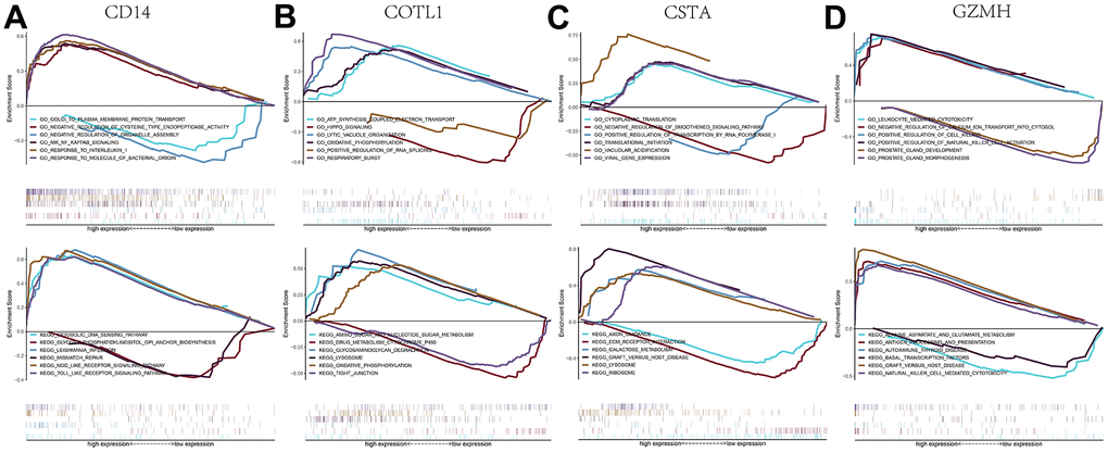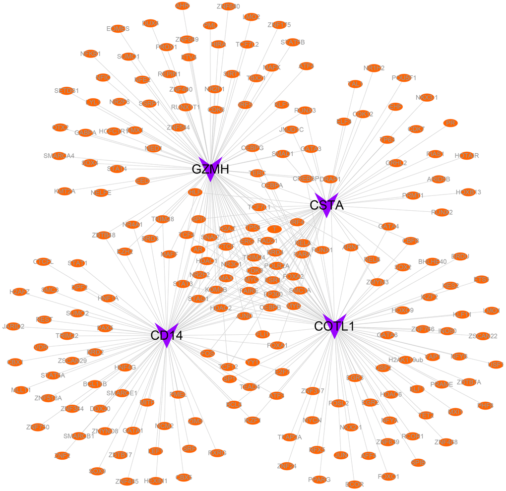 We performed an in-depth enrichment analysis of four key genes to explore the relevant signaling pathways by which they may influence disease progression. For example, we found that the main pathways for gene ontology (GO) enrichment of GZMH gene were “LEUKOCYTE MEDIATED CYTOTOXICITY, NEGATIVE REGULATION OF CALCIUM ION TRANSPORT INTO CYTOSOL, etc” and the pathways for KEGG enrichment mainly included “ALANINE ASPARTATE AND GLUTAMATE METABOLISM, ANTIGEN PROCESSING AND PRESENTATION, etc”. The enrichment results for all four key genes were shown in Figure 8. Subsequently, we compiled these four key genes into a gene set for this analysis to further investigate the transcriptional regulatory networks encompassing these genes. Using the Cistrome DB online database, we identified the transcription factors associated with the key genes.