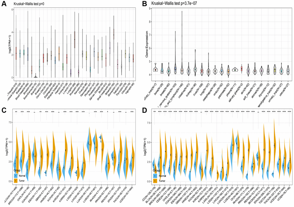R software was utilized to analyze variations in SLAMF8 expression levels between tumor tissues and normal tissues. Subsequently, the distinctions in SLAMF8 expression levels across different normal tissues and various tumor cell lines were examined using the Kruskal-Wallis test. Violin plots depicting the data were generated using the ggplot R package.