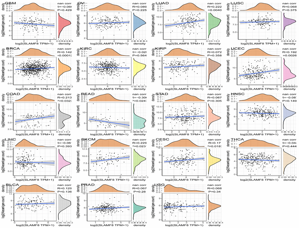 SLAMF8 expression with tumor mutational burden and microsatellite instability