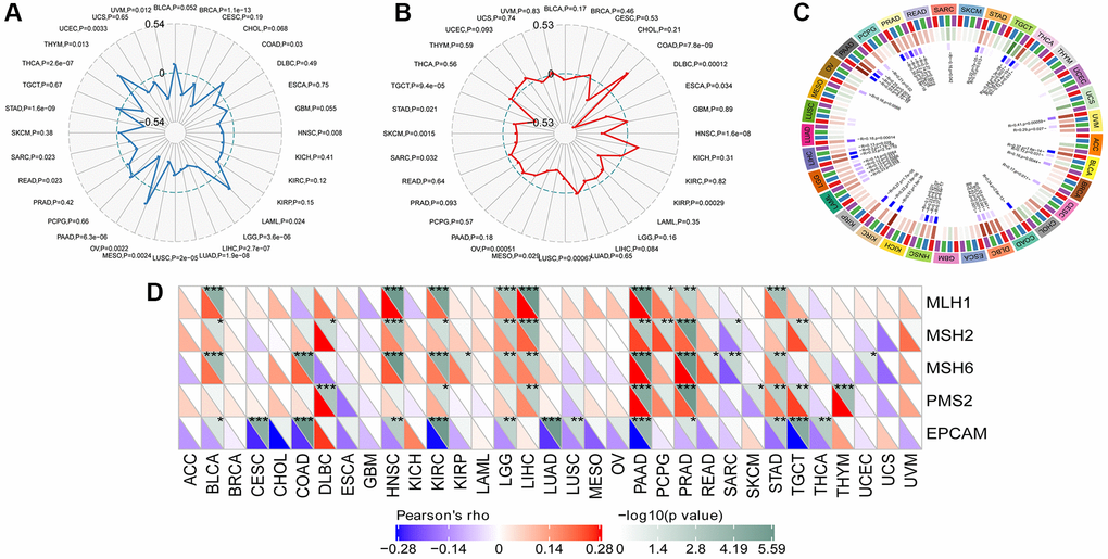Tumor mutational burden (TMB) is considered a measurable indicator for quantifying the number of mutations in tumor cells. It represents the count of somatic mutations in the coding regions of a cancer cell genome, occurring on average at a rate of 1 million bases. Many types of mutations frequently involve the total count of nonsynonymous, which encompasses single nucleotide variations (SNVs) as well as small insertions/deletions. The relationship between SLAMF8 contents and TMB was explored in each tumor type by Spearman’s rank correlation analysis. Figure 11A demonstrated that SLAMF8 exhibited a positive correlation with TMB in COAD, LAML, OV, and THYM. Conversely, TMB showed an inverse association with SLAMF8 in BRCA, HNSC, LGG, LIHC, LUAD, LUCS, MESO, PAAD, READ, SARC, STAD, THCA, UCEC, and UVM.