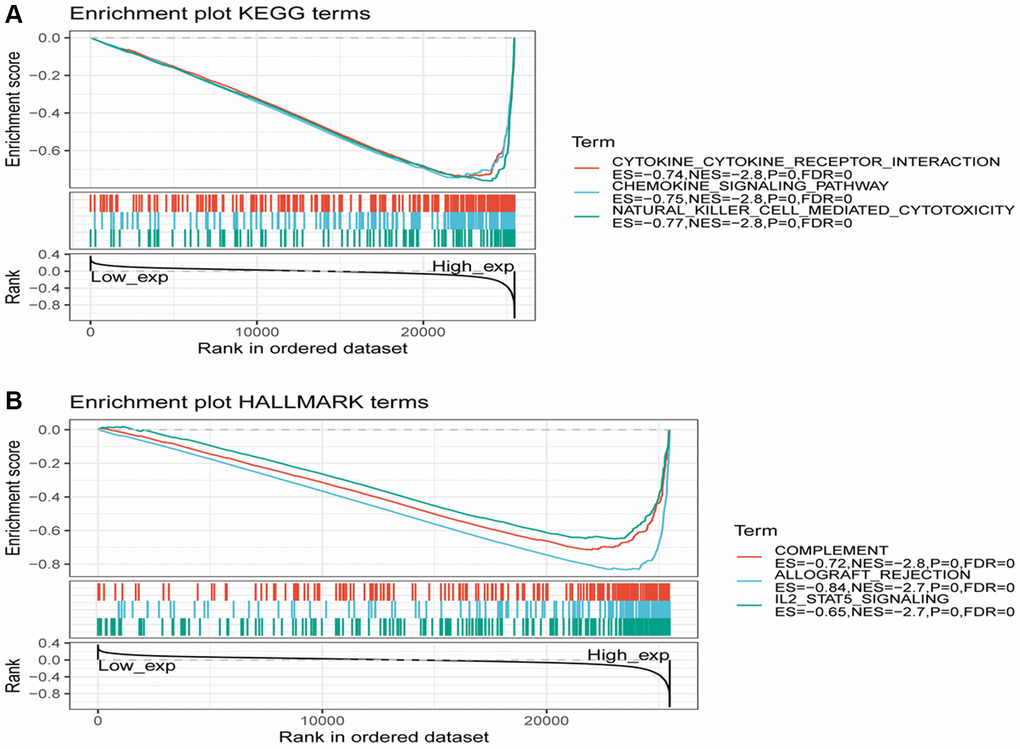 Gene set enrichment analysis (GSEA) is an analytical approach that compares genes with predefined gene sets to investigate their expression status within a specific functional gene set. The evaluation determines if the expression status is significantly related to the biological process, molecular function, or cellular component [14]. Kyoto Encyclopedia of Genes and Genomes (KEGG) is a comprehensive database that integrates genomic, chemical, and systematic functional information. For GSEA analysis, another dataset used is the molecular signatures database (MsigDB) [15], with the Hallmark gene set employed in this analysis. Pathways were considered significantly enriched if they met the sub-conditions of |NES| >1, p-value < 0.05, and FDR < 0.25 as the GSEA threshold.