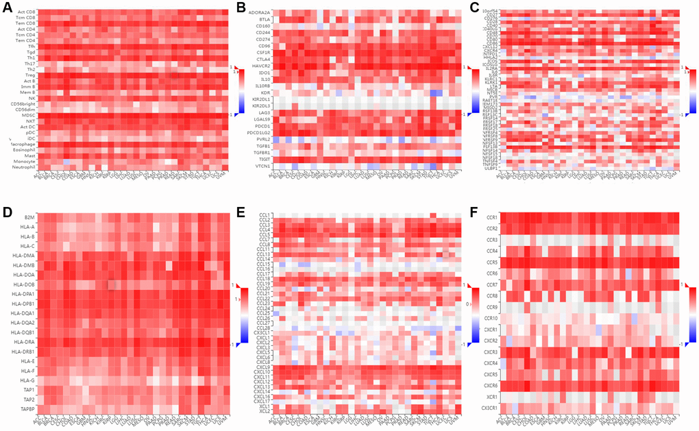 The relationship between SLAMF8 and TILs was explored by using gene set variation analysis (GSVA) based on gene expression profile. Results as shown in Figure 14, SLAMF8 was significantly related to the various types of TILs (such as Tem CD8, Tfh, and MDSC) in the majority types of human cancers. Furthermore, by utilizing gene set variation analysis deponed on the gene expression profile, we discovered a correlation between the expression of SLAMF8 and Immunoinhibitors, Immunostimulators, MHCs, chemokines, and receptors across various types of cancer. According to Figure 14, the expression level of SLAMF8 was found to have a positive correlation with various Immunoinhibitors (like CSF1R, CD96, and HAVCR2), different types of Immunostimulators (such as CD27, IL2RA, and CD86), a wide range of MHCs (including HLA-DMA, HLA-DPB1, and HLA-DRB1), multiple chemokines (like CCL4, CCL18, and CXCL9), and numerous receptors (such as CCR1, CCR2, and CXCR6) in the majority of cancer cases. The aforementioned discoveries indicate that SLAMF8 might have a vital function in the regulation of tumor immunity across various types of cancer.