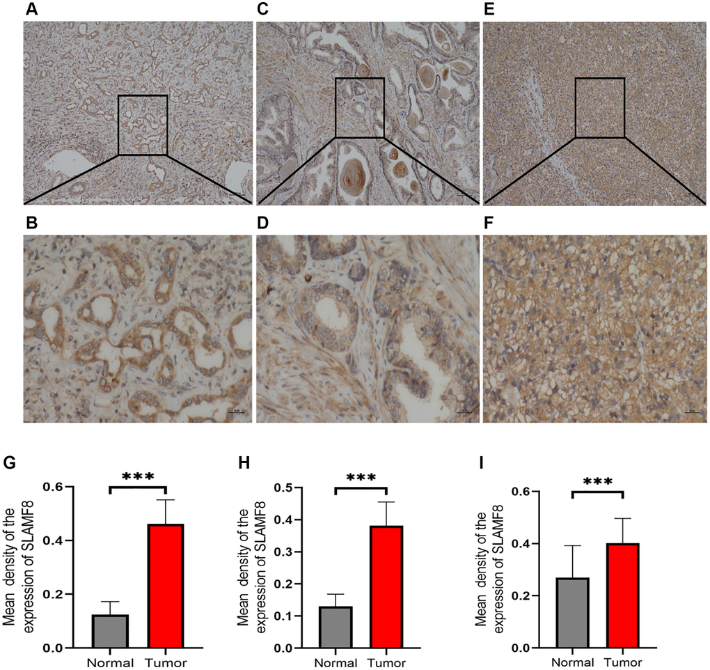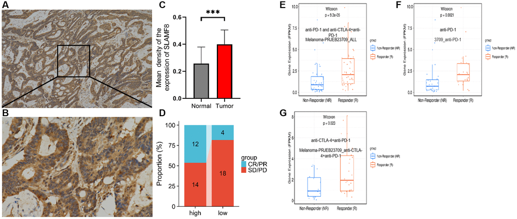 To comprehensively determine the SLAMF8 expression in cancers, as sample, immunohistochemistry was applied to explore the expression of SLAMF8 in HCC (30 cases), PRAD (30 cases), and KIRC (30 cases) tissues and corresponding surrounding tissues. The findings indicated that SLAMF8 exhibited a significant increase in cancer tissues (Figure 16), suggesting its crucial involvement in cancer development. Furthermore, we use the TIGER database to analyze the relationship between SLAMF8 expression and tumor immunotherapy effectiveness (Figure 17), and results demonstrated high SLAMF8 expression was markedly associated with the therapy effectiveness for cancers. Moreover, we found the treatment effectiveness of albumin paclitaxel combined with Sintilimab (anti-pd1) is significantly increased among the patients with STAD with high expression of SLAMF8 and postoperative recurrence (48 cases) which verified the results of the database. Therefore, our findings suggest that SLAMF8 may have a crucial role in the context of tumor immunotherapy.