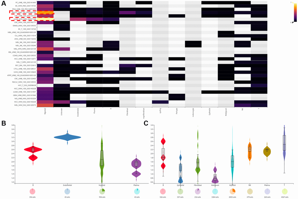 The Tumor Immune Single Cell Hub 2 (TISCH2, http://tisch.comp-genomics.org/) is a single-cell RNA sequencing (scRNA-seq) database that specifically focuses on the tumor microenvironment (TME). This database encompasses 79 datasets and provides single-cell transcriptome profiles for more than 2 million cells. Additionally, the IMMUcan scDB (https://immucanscdb.vital-it.ch/) comprises 144 datasets covering 56 different cancer types, annotated in 50 fields with precise clinical, technological, and biological information. Another online database, TIGER (http://tiger.canceromics.org/#/), contains bulk transcriptome gene expression data for 1508 tumor samples across 8 cancer types, including clinical immunotherapy information from 20 published studies, as well as 11,057 tumor/normal samples from 33 cancer types. In our study, we systematically utilized TISCH2, the IMMUcan database (search by gene and annotation major), and TIGER to investigate TME heterogeneity.