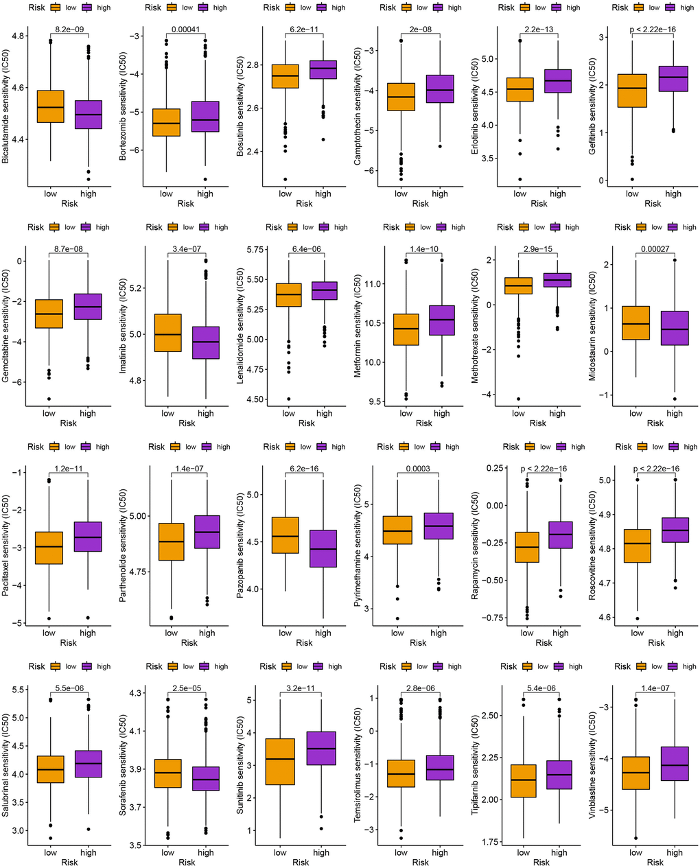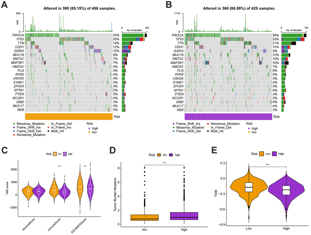 We next looked at how the distribution of somatic mutations varied in the TCGA-BC cohort. In the high- and low-risk groups, the top 10 mutations were PIK3CA, TP53, TTN, CDH1, GATA3, MUC16, KMT2C, MAP3K1, HMCN1, and FLG (Figure 9A, 9B). When compared to patients in low-risk score group, those in high-risk score group exhibited greater frequencies of PIK3CA, TP53, TTN, and CDH1 mutations. Compared to the low-risk group, patients in the high-risk group had an obviously higher frequency of PIK3CA mutations than those in the low-risk group. High-risk groups were related to a high stromal score, while low-risk groups were associated with higher immune scores (Figure 9C). Furthermore, low OS was linked to increased TBM (p<0.001; Figure 9D). The high-risk group’s TIDE score was lower, indicating that they may have been more responsive to immunotherapy (Figure 9E). Furthermore, we observed significant differences in treatment susceptibility between the two patient groups by comparing the IC50 of commonly used cancer drugs (Figure 10).