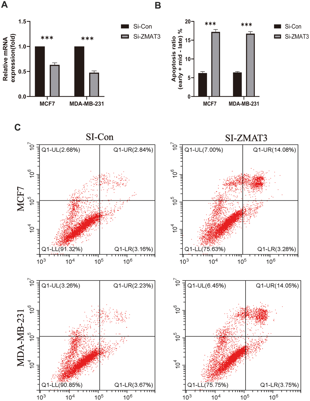To further examine the clinical impact of target genes, the ZMAT3 gene was knocked down for subsequent analysis. Following transfection with siRNA, a reduction in ZMAT3 mRNA expression was observed in both MDA-MB-231 and MCF-7 cells. Knockdown of ZMAT3 induced apoptosis in the two cell lines, as reflected in the flow cytometry results (Figure 11B, 11C), with higher numbers of early and late apoptotic cells observed compared to the control group (Figure 11A). These findings suggest that ZMAT3 may play a role in the regulation of apoptosis in BC cells and could be a potential therapeutic target.