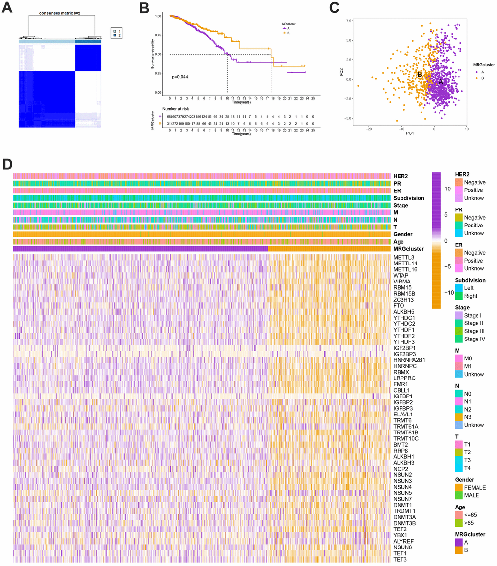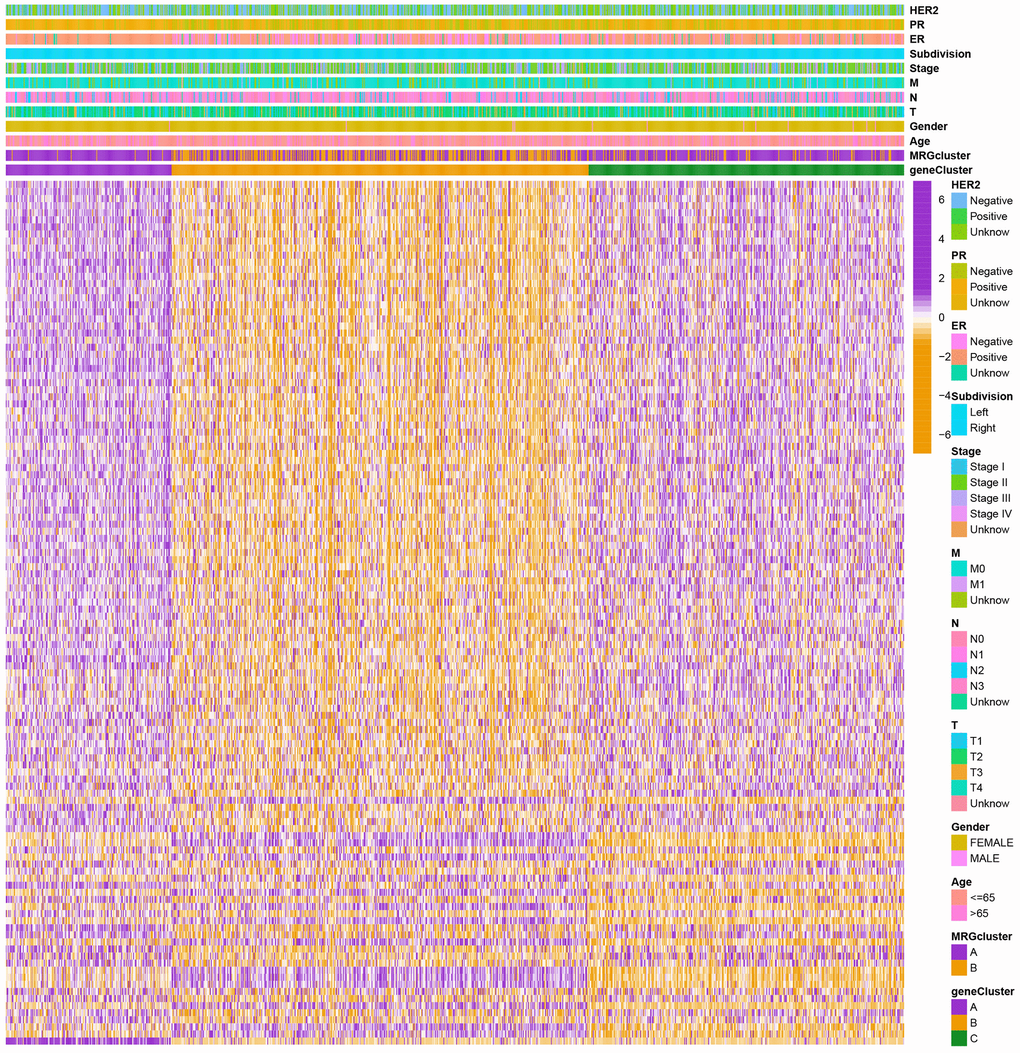 Kaplan-Meier curves were used to compare OS among the two MRG clusters, which was generated by the “survival” and “survminer” R programs. The two different MRG clusters showed a significant difference in the MRG transcriptional profile. Patients with decreased MRG cluster revealed significant therapeutic advantages and clinical benefits. In addition, we evaluated the association between genetic subtypes, clinicopathological traits, and prognosis to explore the clinical utility of the two clusters through consensus clustering. HER2, PR, ER, age, gender, tumour site, TNM stage, subtypes, and clinical stage were patient characteristics.