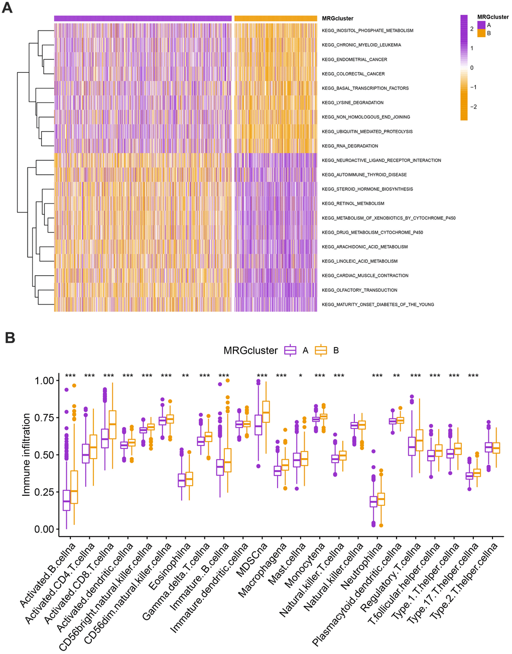 The GSVA enrichment analysis revealed a significant difference between MRG clusters B and A. One of them focuses on inositol phosphate metabolism, chronic myeloid leukemia, endometrial cancer, and colorectal cancer, while the other one is maturity-onset diabetes of the young, olfactory transduction, cardiac muscle contraction, and linoleic acid metabolism (Figure 3A and Supplementary Table 3). We look into the relationships between the 22 different subsets of human immune cells and the two subtypes of each BC sample using the CIBERSORT method. There were considerable changes in the invasion patterns of immune cells between the two kinds (Figure 3B).