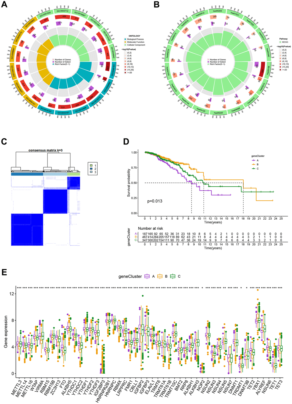 To investigate the biological behavior that underpins each focused flash pattern, 4097 DEGs associated with MRG cluster were found using the R package “limma”. Functional enrichment analysis was then carried out on this data (Figure 4A, 4B). These DEGs were involved in immunity and were present during all biological activities (Figure 4A and Supplementary Table 4). By demonstrating that cancer- and immunological-related pathways were enriched, KEGG analysis demonstrated the significance of methylation in the immune regulation of the TME (Figure 4B and Supplementary Table 4). Using univariate Cox regression analysis, 122 genes related to OS duration were chosen ((p<0.01). In order to validate these regulatory mechanisms, patients were divided into three gene categories based on prognostic genes using consensus clustering methodologies. Based on k = 3, we conclude that the entire cohort was the best option for gene clusters A, gene clusters B, and gene clusters C (Figure 4C). According to Kaplan-Meier curves (p<0. 013; Figure 4D), patients with gene cluster B had the highest OS, which is better than that of cluster A and cluster C. The three gene clusters’ MRG expression varied significantly, which was in line with our assumptions (Figure 4E). A study of the clinicopathological characteristics of several gene clusters also uncovered a large diversity in clinical characteristics (Figure 5).