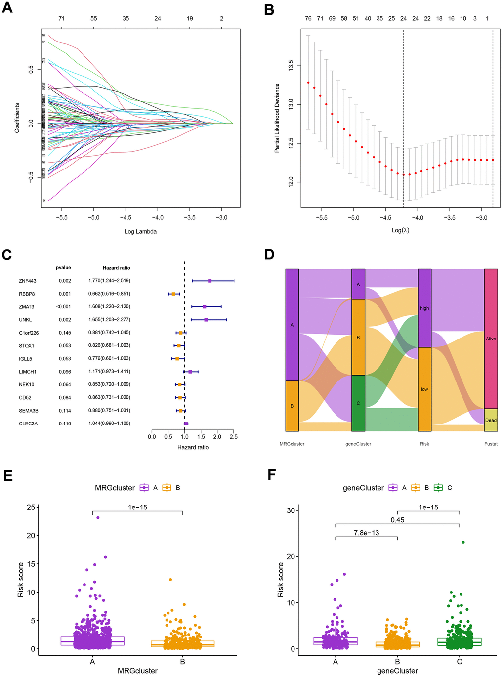 Using the “caret package” in R, we first randomly divided the patients into training and testing groups at a ratio of 0.7:0.3 to examine the independent prognostic significance of the MRGs for BC patients. Next, LASSO and univariate Cox regression analysis were carried out (Figure 6A–6C). LASSO Cox regression analysis using the “glmnet” software to find the MRGs with the best prognostic value (Figure 6A, 6B). As shown in Figure 6C, 12 genes associated with the OS of BC patients were initially screened using univariate Cox proportional hazard regression analysis. The relationship between the MRG cluster, gene cluster, risk groups, and survival status was depicted using a Sankey diagram (Figure 6D). The risk score distributions for the two MRG clusters and three gene clusters are shown in Figure 6E, 6F.