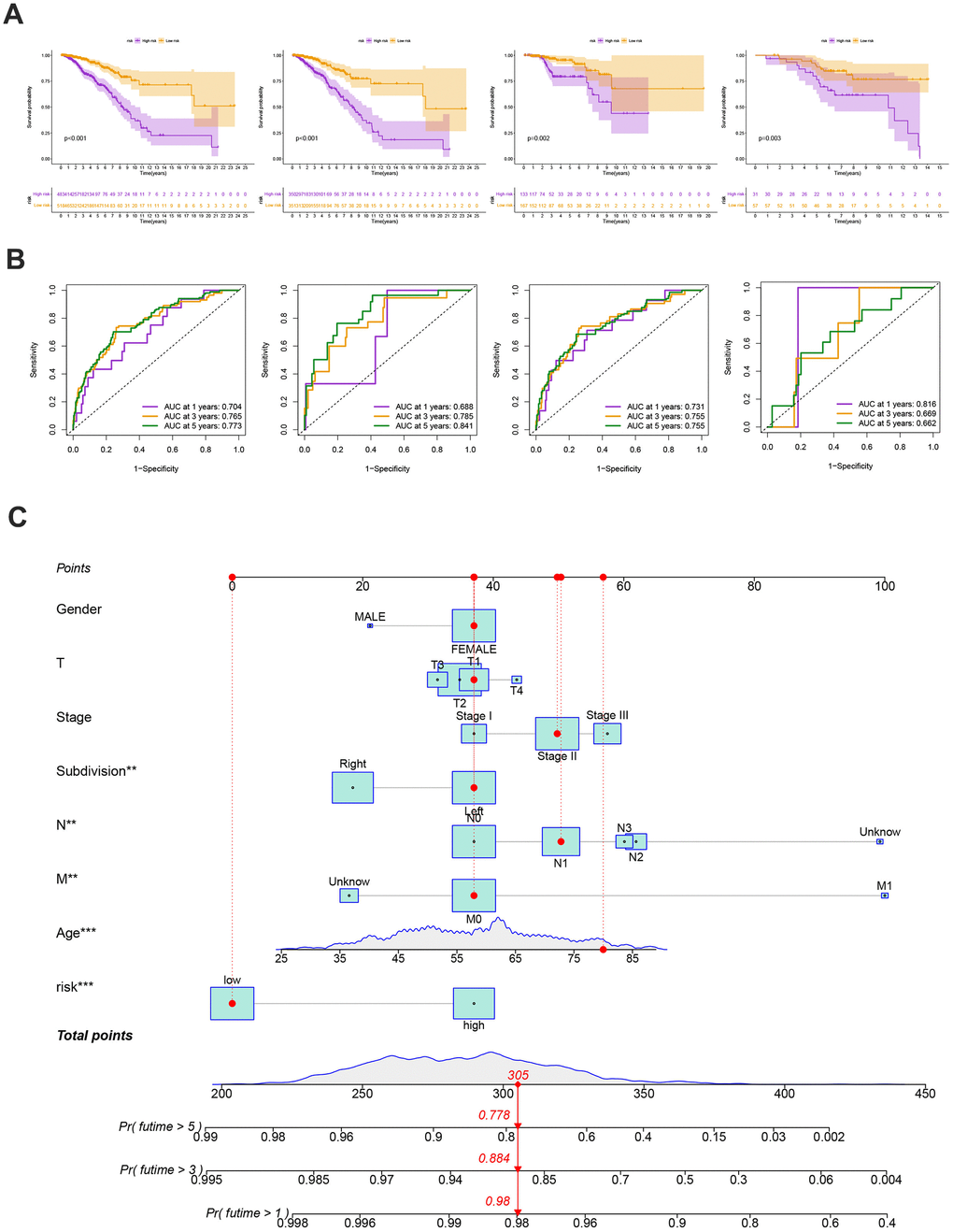 Our findings supported the use of the entire set, the training set, the testing set, and the GEO external validation set. Figure 7A’s Kaplan-Meier analysis indicates that patients in the low-risk group will likely survive longer. The ROC curves showed the model’s high sensitivity and specificity for predicting survival, and the entire set’s 5-year AUC value was 0.773 (Figure 7B). Figure 7A, 7B shows the analysis for the training set, the testing set, and the GEO external validation set, which demonstrates the model’s dependability. The nomogram containing the model and clinical features was performed accurately and sensitively for predicting survival in BC patients (Figure 7C).