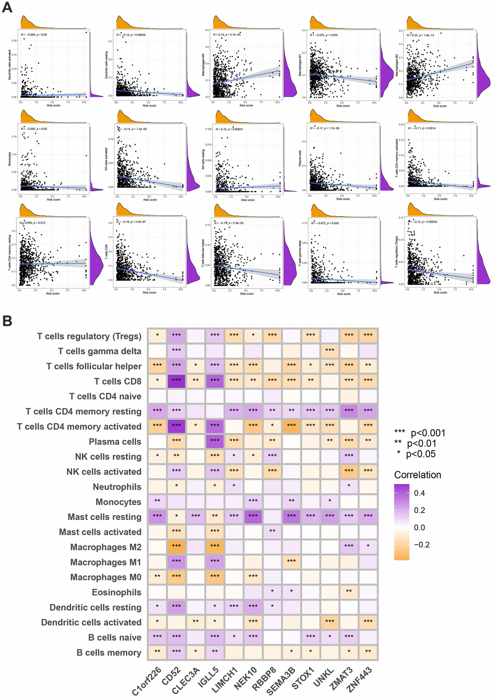 The following data was evaluated using the CIBERSORT algorithm. The scatter diagrams revealed that the risk score was inversely correlated with resting dendritic cells, M1 macrophages, monocytes, plasma cells, activated NK cells, follicular helper T cells, gamma delta T cells, regulatory T cells, and activated memory CD4 + T cells (Figure 8A). We also explore the relation between the number of immune cells and 12 genes in this model and found a significant correlation between most immune cells and 12 genes (Figure 8B).