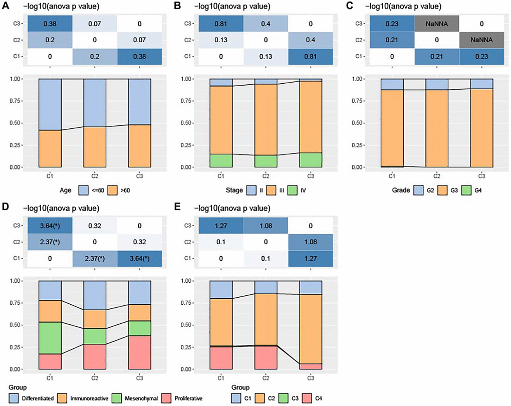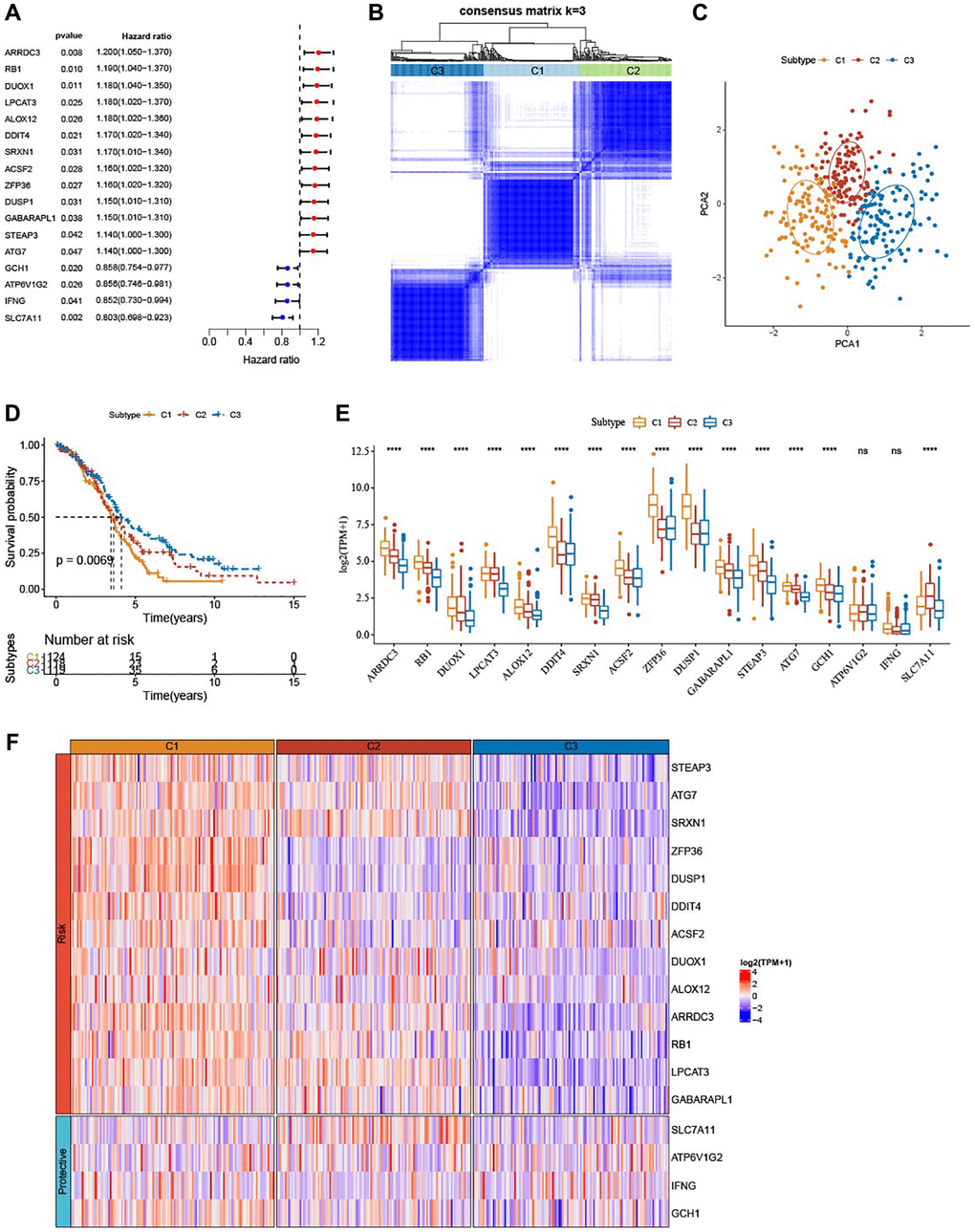 The relationship of clinicopathological characteristics including age, Stage, Grade and ferroptosis subtypes was explored. Also, other immune subgroups including C1 (Wound Healing), C2 (IFN-γ Dominant), C3 (Inflammatory), and C4 (Lymphocyte Depleted) as well as “differenced”, “immunoreactive”, “mesenchymal”, and “proliferative” were collected from a previous study [16]. Distributions of clinicopathological features among the three subtypes were analyzed using ANOVA.