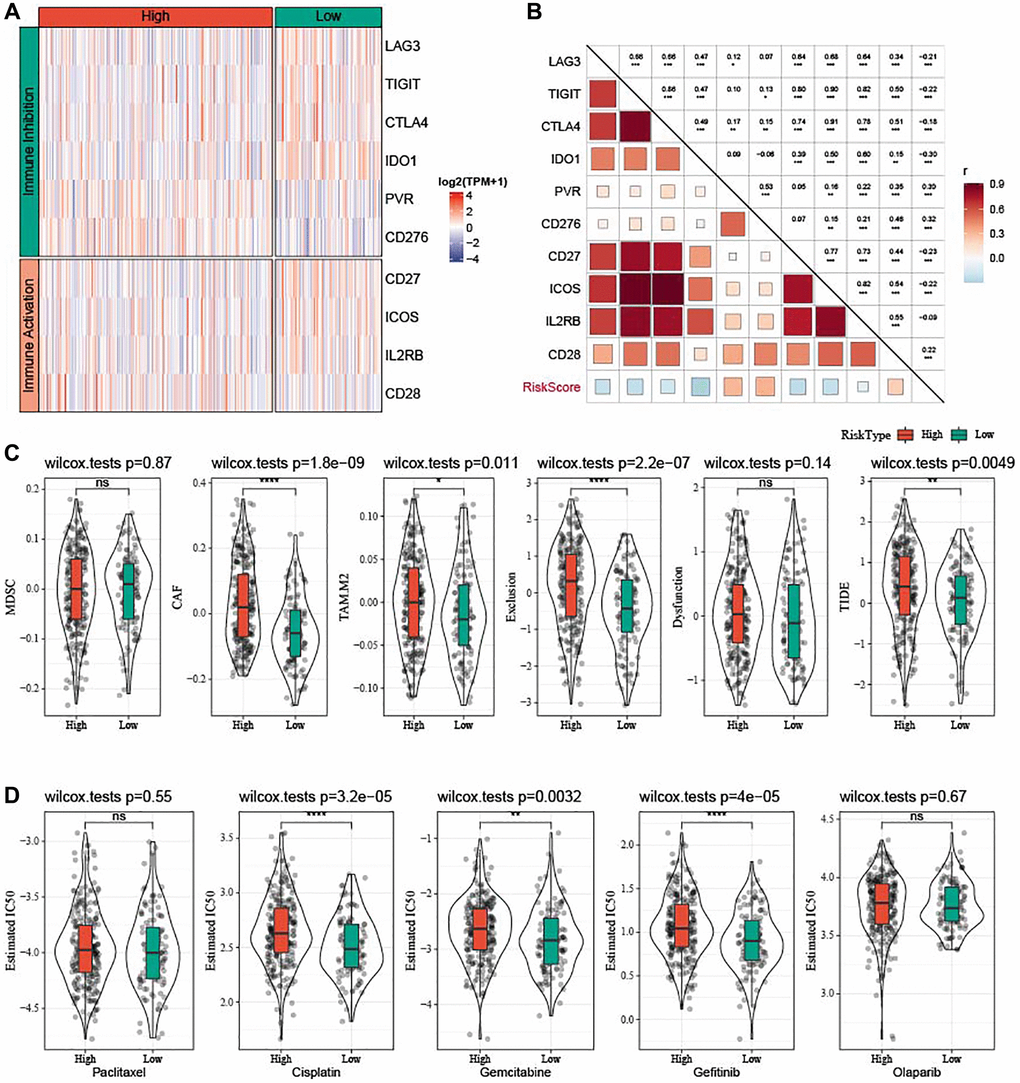 Patients’ response to ICI therapy was evaluated using TIDE algorithm [31], with a high TIDE score indicating low response to ICI therapy. Immune checkpoints were obtained from a previous study [32]. The “ComplexHeatmap” package was used to compare immune checkpoint expression patterns between high- and low-risk groups. The relationship between risk score and immune checkpoints was analyzed using “ggcorrplot” package. Meanwhile, IC50 was calculated by the “pRRophetic” program [33] and compared in the two risk groups using wilcox.tests. Statistical significance was defined when P < 0.05.