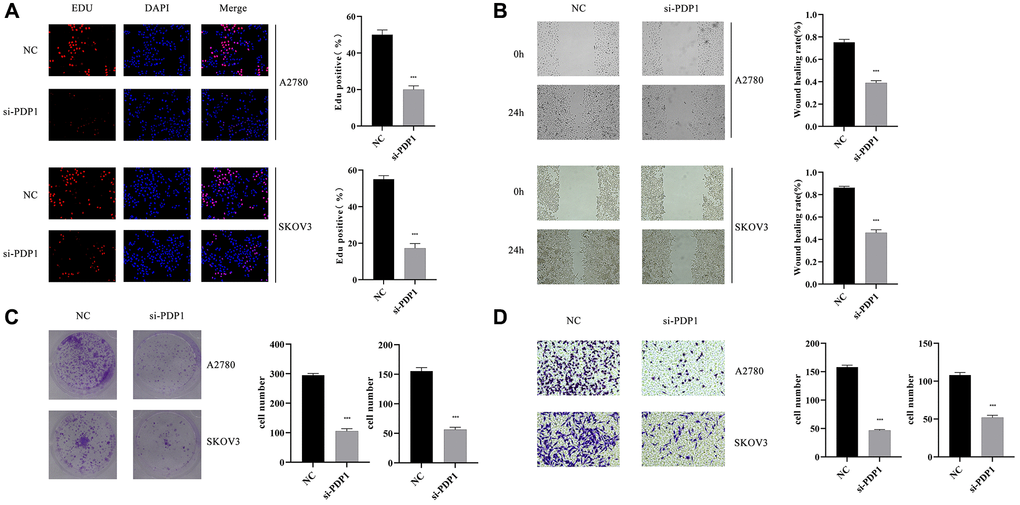 The PDP1 gene in the two OV cell lines was knocked down, and we conducted multiple phenotypic experiments to investigate its impact on OV cancer cells. The EdU assay showed that the si-PDP1 group had fewer proliferating cells when compared to the negative control group, indicating reduced proliferation of OV cells (p < 0.001, Figure 11A). In the colony formation assay, the si-PDP1 group formed significantly fewer cell colonies than the control group, which showed reduced level of cancer cell proliferation from a macroscopic perspective (p < 0.001, Figure 11C). The wound-healing assay revealed that compared to the negative control group, the ability of si-PDP1 group cells to migrate declined (p < 0.001, Figure 11B). After PDP1 knockdown, the transwell assay demonstrated a significant decrease in the number of cells invading the lower surface of the chamber (p < 0.001, Figure 11D). Collectively, our findings indicated that proliferation, invasion, and migration of OV cells could be promoted by PDP1.
