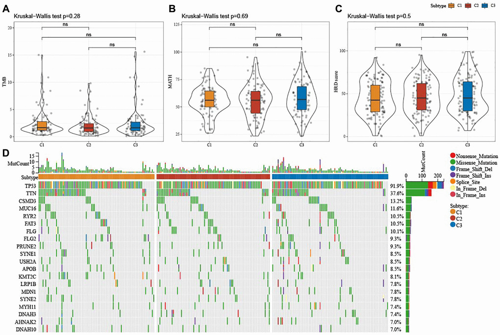 Figure 3A–3C displayed no significant differences in TMB, MATH, and HRD among the three subtypes (P > 0.05). Meanwhile, analysis on the mutation characteristics of top 20 mutated genes in each subtype showed higher mutation frequencies of TP53 (91.9%) and TTIN (37.6%) (Figure 3D).