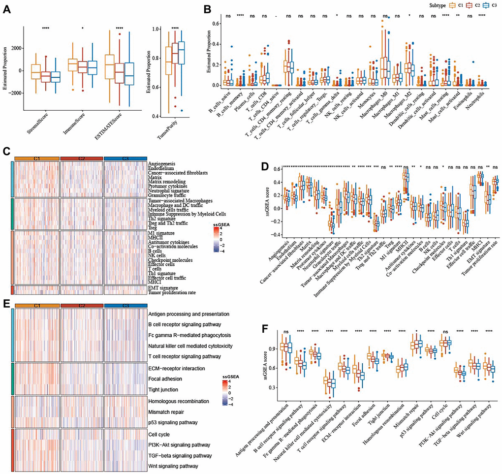 The results from ESTIMATE showed that StromalScore (P < 0.0001), ImmuneScore (P < 0.05), and ESTIMATEScore (P < 0.0001) were remarkably higher in subtype C1, but TumorPurity (P < 0.0001) was lower in subtype C1 when compared to subtype C2 and subtype C3 (Figure 4A). Significant alterations in the abundance of immune cells infiltration among the three subtypes were analyzed, and we found that subtype C1 had abundant Macrophages_M2 (Figure 4B). SsGSEA scores for 29 TME-related gene signatures demonstrated that matrix, matrix remodeling, angiogenesis, cancer-associated fibroblasts (CAF), endothelium, protumor cytokines, and EMT signature were enriched in subtype C1 (Figure 4C, 4D). Moreover, subtype C1 had distinctly higher scores of Wnt signaling pathway, PI3K-Akt signaling pathway, TGF-β signaling pathway (Figure 4E, 4F).