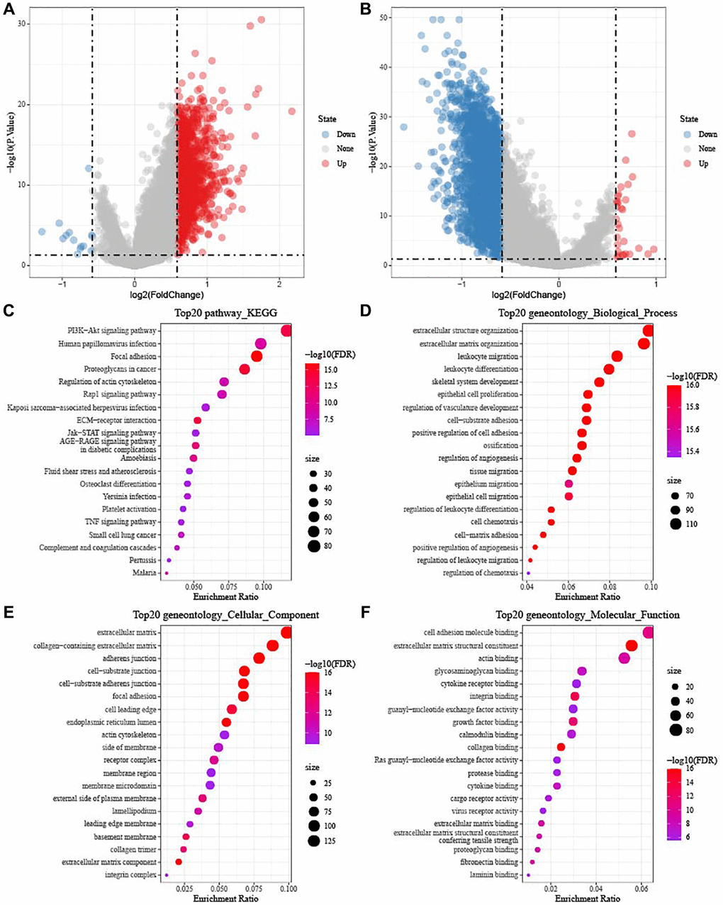 Furthermore, we identified 1420 DEGs from subtype C1 (including 1406 upregulated and 14 downregulated genes) (Figure 5A), 51 DEGs from subtype C2 (including 19 upregulated and 32 downregulated genes), and 3120 DEGs from subtype C3 (including 30 upregulated and 3090 downregulated genes) (Figure 5B). Next, differentially up-regulated genes in subtype C1 and down-regulated genes in subtype C3 were subjected to functional GO and KEGG pathway enrichment analysis. As shown in Figure 5C, focal adhesion and proteoglycans, PI3K-Akt signaling pathway in cancer were significantly enriched in subtype C1. Figure 5D–5F showed the top 20 enriched GO terms (BP, CC, and MF). As for BO, subtype C had enriched regulation of extracellular matrix organization, angiogenesis, and positive regulation of cell adhesion.
