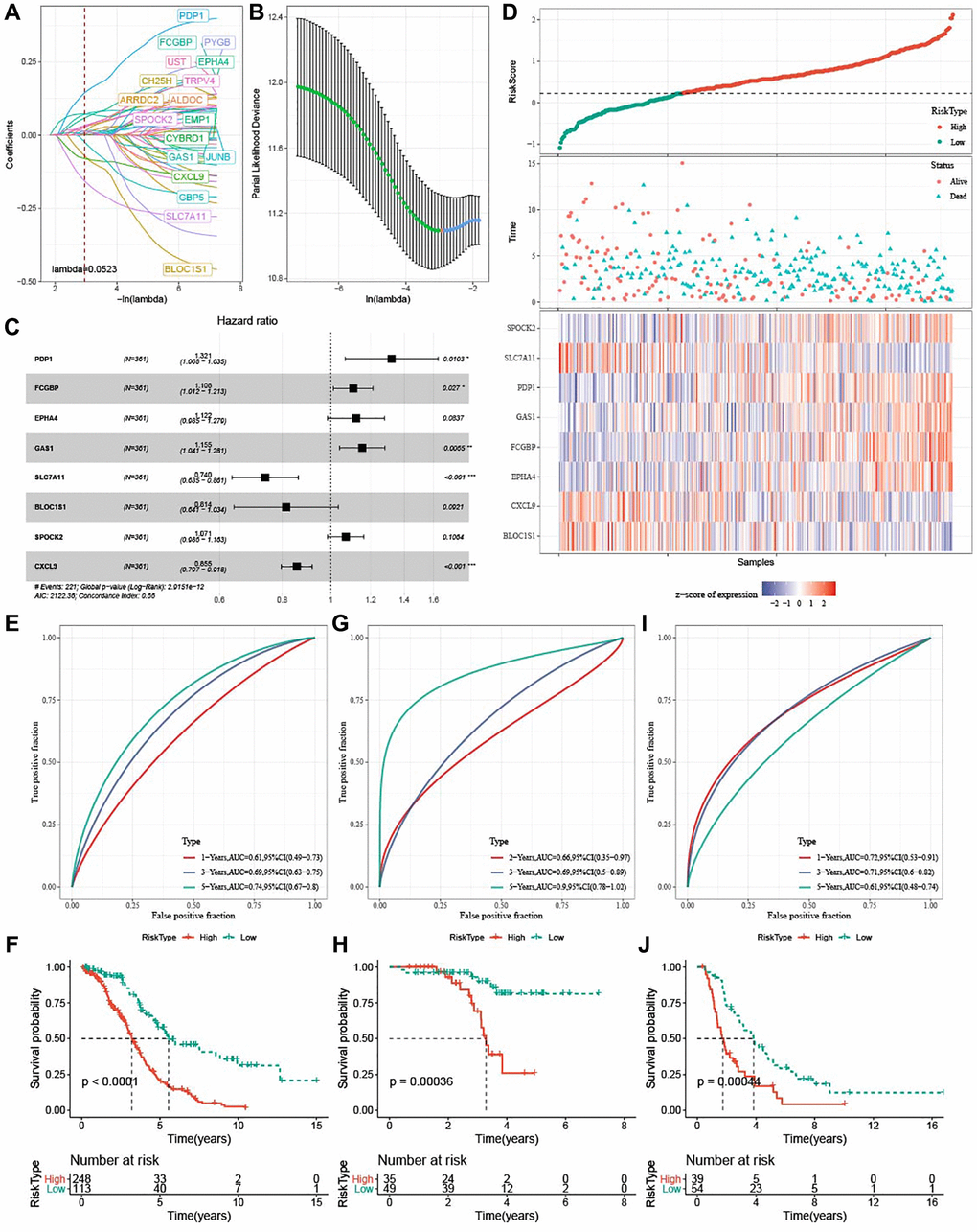 A total of 52 (47 risk genes and 5 protective genes) genes with greater impact on prognosis were identified from a total of 3,384 DEGs. LASSO Cox regression was carried out to compress gene number in the risk model. Figure 6A displayed mutual increases in both the number of independent variable coefficients close to zero and the lambda. See Figure 6B for confidence interval under each lambda in 10-fold cross-validation. Using stepwise multivariate regression analysis and stepAIC under lambda = 0.052, 8 ferroptosis-related genes (PDP1, FCGBP, EPHA4, GAS1, SLC7A11, BLOC1S1, SPOCK2, and CXCL9) affecting OV prognosis were selected (Figure 6C). The risk score was calculated with the formula: risk score = + 0.279 × PDP1 + 0.102 × FCGBP + 0.115 × EPHA4 + 0.144 × GAS1 −0.302 × SLC7A11-0.205 × BLOC1S1 + 0.068 × SPOCK2 −0.156 × CXCL9. We found that high-risk patients in TCGA dataset showed a poor prognostic outcome (Figure 6D). In TCGA cohort, the survival of high-risk patients was worse than low-risk patients (P < 0.0001), with 1-year AUC of 0.61, 3-year AUC of 0.69, and 5-year AUC of 0.74 (Figure 6E, 6F). The model robustness was verified using GSE102073 cohort and ICGC-AU cohort because 1-year, 3-year and 5-year in GSE102073 cohort was 0.66, 0.69, and 0.90, respectively, and in ICGC-AU cohort was 0.72, 0.71, and 0.61, respectively (Figure 6G–6J).