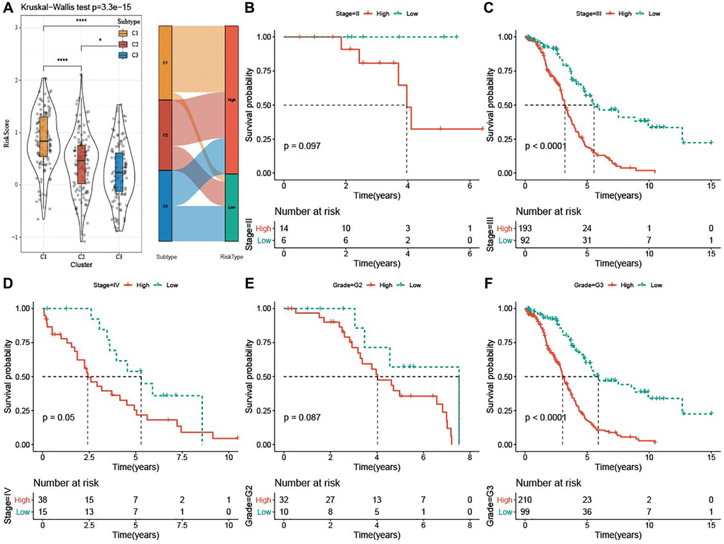 For high- and low-risk groups, risk score distribution among the three subtypes was analyzed using the Kruskal.test and the Sankey diagram. KM curves were generated to compare the low- and high-risk groups in terms of several clinicopathological parameters (Stage II-IV and Grade G2-G3).