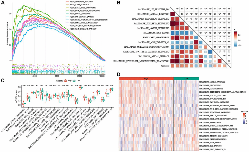 To clarify whether there were differentially activated pathways in high- and low-risk groups, we performed GSEA analysis using KEGG database and Hallmark gene sets. KEGG_BASAL_CELL_CARCINOMA, KEGG_ECM_RECEPTOR_INTERACTION, KEGG_TGF_BETA_SIGNALING_PATHWAY and KEGG_WNT_SIGNALING_PATHWAY (two EMT-related pathways), KEGG_FOCAL_ADHESION were enriched in the low-risk group (Figure 8A). In addition, high risk was positively associated with pathways involved in EMT process, such as HALLMARK_WNT_SIGNALING, and HALLMARK_TGF_BETA_SIGNALING, HALLMARK_NORCH_SIGNALING, HALLMARK_EPITHELIAL_MESENCHYMAL_TRANSITION (Figure 8B). As illustrated in Figure 8C, 8D, high-risk score group had significantly enriched EMT-related pathways.