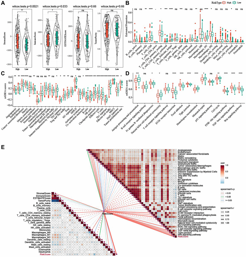 Furthermore, we evaluated the immune cell infiltration between the two risk groups by ESTIMATE algorithm, and the differences were analyzed using wilcon.tests. The abundances of 22 immune cells were measured by CIBERSORT. The ssGSEA method was employed to score the 15 pathways-related gene signatures and 29 TME-related gene signatures. Comparisons were performed using kruskal.test. Statistical significance was defined when P < 0.05. Next, the correlation between immune cell infiltration, 22 immune cells and risk score was analyzed by “ggcorrplot” package.