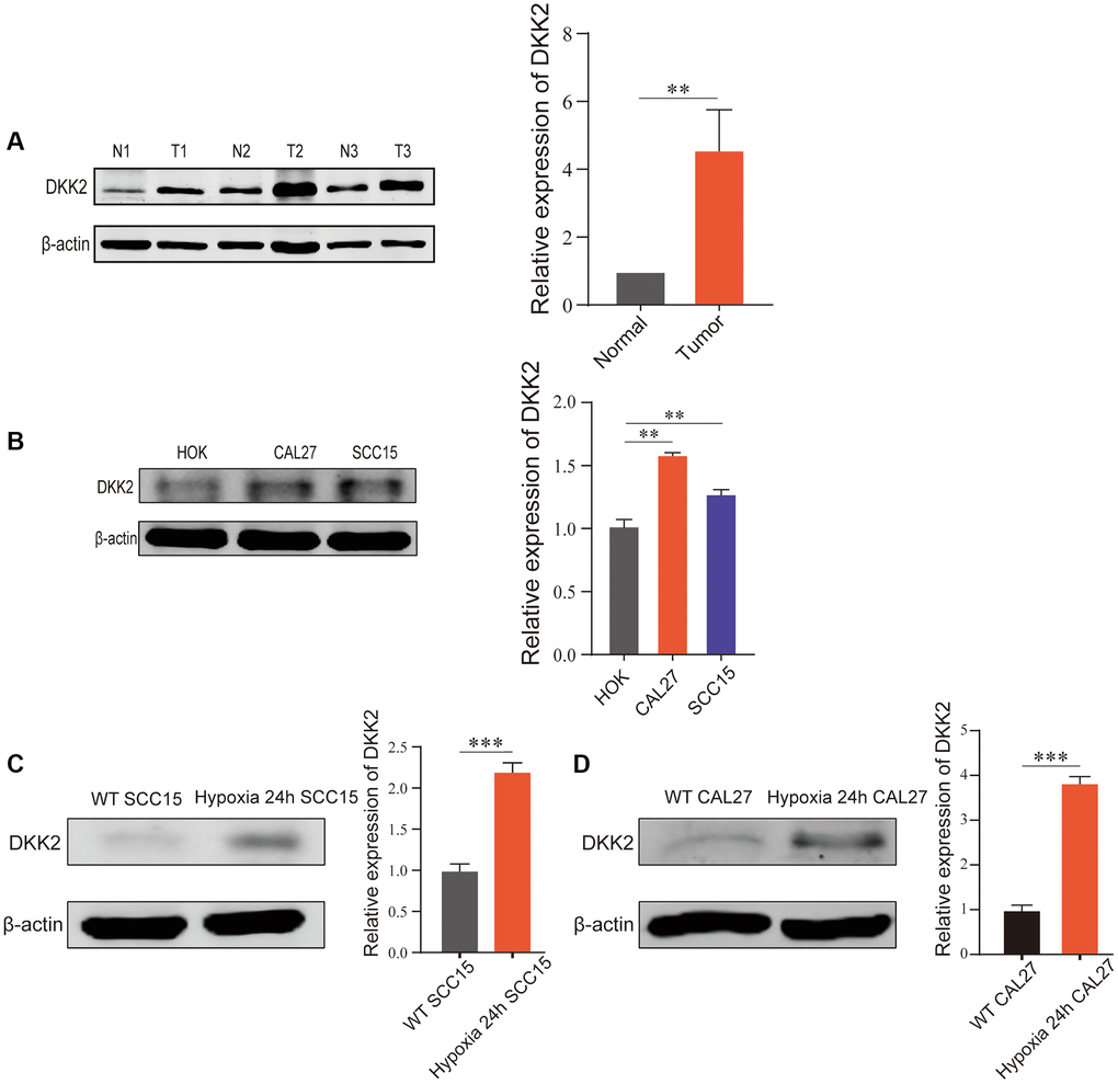 Firstly, we examined the expression of DKK2 in OSCC tissues and adjacent non-cancerous tissues using Western Blot. The results showed a significant upregulation of DKK2 in OSCC tissues compared to adjacent non-cancerous tissues (Figure 1A). Subsequently, we validated DKK2 expression in OSCC cell lines. Western Blot analysis of normal oral mucosal cell line HOK and OSCC cell lines CAL27 and SCC15 revealed a significant overexpression of DKK2 in both OSCC cell lines (Figure 1B). As OSCC is a solid tumor with a characteristic hypoxic center, which may have a crucial impact on tumor development, we simulated hypoxic conditions in vitro to investigate the changes in DKK2 expression in CAL27 and SCC15 cell lines. The results showed an increased expression of DKK2 under hypoxic conditions compared to normoxic conditions in both cell lines (Figure 1C, 1D).