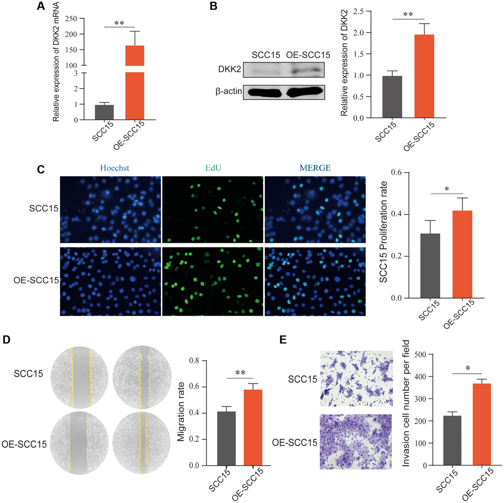 After transfection of the DKK2 overexpression plasmid in SCC15 cells, we confirmed the overexpression efficiency using qPCR and Western Blot. The results showed a significant increase in DKK2 mRNA and protein compared to the empty vector control group (Figure 2A, 2B). Subsequent biological function experiments revealed that overexpression of DKK2 significantly enhanced the proliferation ability of OSCC cells, as indicated by the EdU assay (Figure 2C). Furthermore, scratch healing experiments demonstrated that overexpression of DKK2 increased the migration ability of SCC15 cells (Figure 2D), and Transwell assays showed a significant enhancement in the invasive capability of OSCC cells with DKK2 overexpression (Figure 2E).