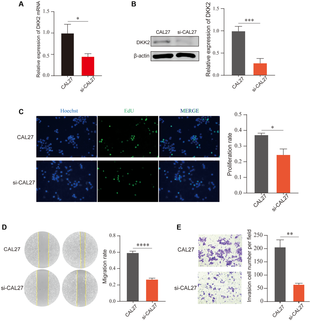Similarly, we knocked down DKK2 in another OSCC cell line, CAL27, and confirmed the significant knockdown efficiency using qPCR and Western Blot (Figure 3A, 3B). EdU assay results showed that the proliferation ability of OSCC cells decreased after DKK2 knockdown (Figure 3C). Scratch healing and Transwell assay results also indicated a reduction in the malignant biological behavior of OSCC cells, with decreased migration and invasion abilities after DKK2 knockdown (Figure 3D, 3E). Our experiments suggest that DKK2 plays a strong promoting role in the progression of OSCC, increasing the malignant biological behavior of OSCC cells and potentially serving as an effective therapeutic target.