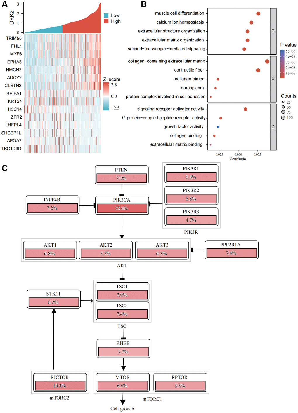 We used bioinformatics analysis to generate a co-expression heatmap of potential downstream genes of DKK2 (Figure 4A) and performed functional enrichment to explore the possible mechanisms by which DKK2 functions in OSCC (Figure 4B). The results indicated that DKK2 and its downstream genes might affect the extracellular matrix, consistent with our previous findings on the impact of DKK2 on the migration and invasion capabilities of OSCC. Mechanistically, DKK2 may influence second messenger signaling and receptor activation. Pathway analysis also suggested that, in addition to its impact on the Wnt signaling pathway, DKK2 has a significant regulatory role in the PI3K/AKT signaling pathway (Figure 4C).