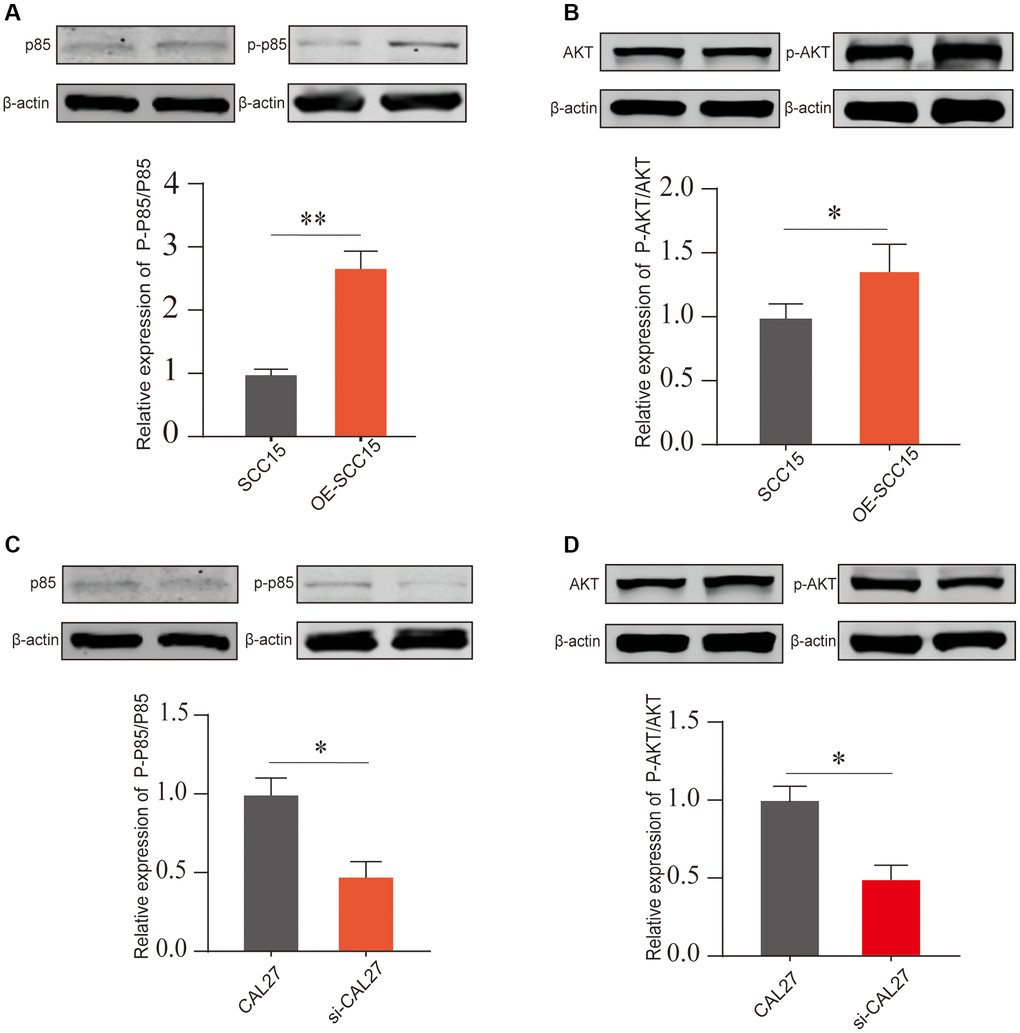 We next molecularly validated the impact of DKK2 on the PI3K/AKT signaling pathway. In SCC15, overexpression of DKK2 led to a significant increase in phosphorylation of p85 and, while total protein expression remained nearly unchanged (Figure 5A). Similarly, DKK2 also increased the phosphorylation level of AKT (Figure 5B). This indicates that increased expression of DKK2 can promote the activation of the PI3K/AKT signaling pathway, thereby enhancing the proliferation of OSCC cells. We also conducted the same validation in CAL27 cells; after knocking down DKK2, a decrease in the phosphorylation levels of p85 and AKT proteins was observed (Figure 5C, 5D). This suggests that the high expression of DKK2 in OSCC can promote the activation of the PI3K/AKT signaling pathway, contributing to the progression of OSCC.