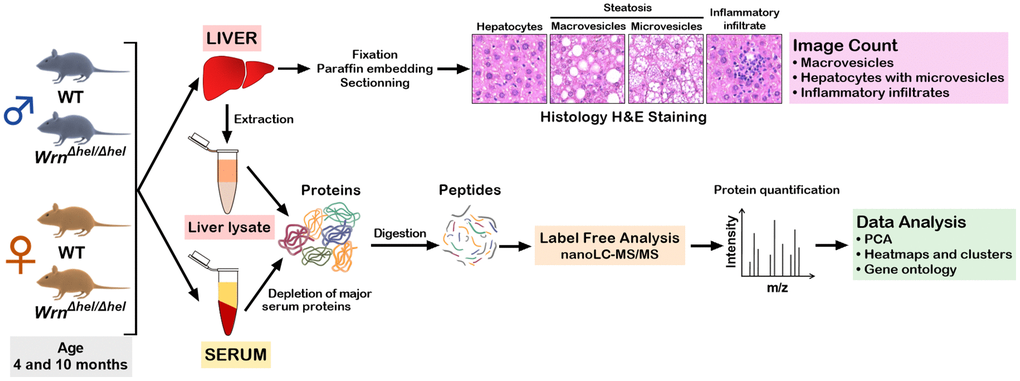 In summary, our detailed proteomic profiles study of wild type and WrnΔhel/Δhel mice at four and ten months of age revealed a sexual dimorphism in the liver tissue and the serum of these animals. Interestingly, although both females and males exhibited macrovesicular and microvesicular steatosis, proteins implicated in lipid and fatty acid metabolic processes were specifically increased in the liver of ten months old WrnΔhel/Δhel males. We infer that a mutation in the Wrn enzyme exacerbated these processes with age. Serum proteins related to oxidant detoxification processes were also increased in WrnΔhel/Δhel males regardless of age. Finally, several proteins that were altered in both the liver and serum of middle-aged WrnΔhel/Δhel males and females are also associated with different aspects of chronic liver diseases (from NAFLD to NASH and cirrhosis) in human subjects based on the literature. Further investigation on the combination of these protein alterations through machine learning will be required to assess their relevance to NAFLD status and progression in human subjects. Future thorough examination of NAFLD in Werner syndrome patients will indicate whether similar biological processes are also affected in such patients and whether they exhibit sexual dimorphisms.