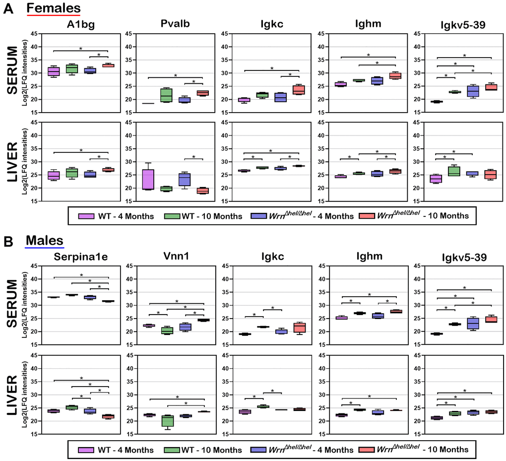 To identify proteins whose serum abundance was reflected by alterations in the liver, we integrated the liver and serum proteomes by looking for common features among the datasets in the females (Supplementary Tables 4 and 9) and the males (Supplementary Tables 5 and 10). Figure 10A reveals that five proteins were significantly altered in both the liver and serum when we compared the different groups of females. Alpha-1-B glycoprotein (A1bg) abundance was generally higher in the liver and serum of ten months old WrnΔhel/Δhel females than in the other groups of females. Serum parvalbumin (Pvalb) abundance was significantly increased in ten months old WrnΔhel/Δhel females compared to four months old wild type and WrnΔhel/Δhel females. However, the pattern of Pvalb abundance in the different groups of females was different compared to the serum levels in these same females (*p-value < 0.05 in Figure 10A). The abundance of serum immunoglobulin molecules Igkc, Ighm, and Igkv5-39 were similar in the different groups of females. The highest abundance of these molecules was found in the serum of ten months old WrnΔhel/Δhel females (*p-value < 0.05 in Figure 10A). This pattern of expression was similar in the liver of ten months old WrnΔhel/Δhel females for Igkc and Ighm. However, the abundance of Igkv5-39 was the highest in the liver of ten months old wild type females compared to the other groups of females based on mass spectrometry data (*p-value < 0.05 in Figure 10A).